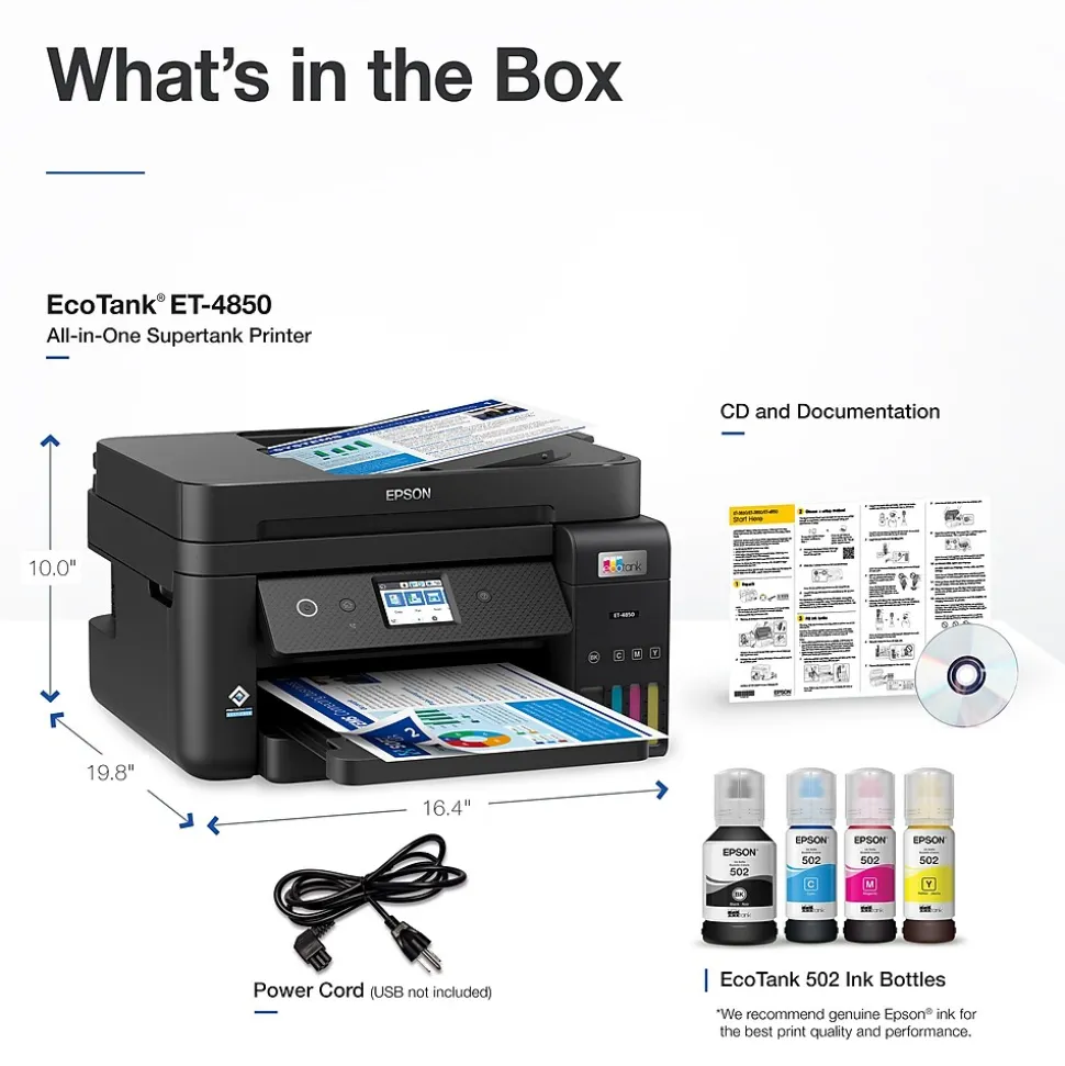 | Series or Collection | EcoTank ET-4850 all-in-one, manual, power cord, 1 bottle of 502® Black (127 mL) and 1 bottle each of 502 Cyan, Magenta, Yellow (70 mL) |