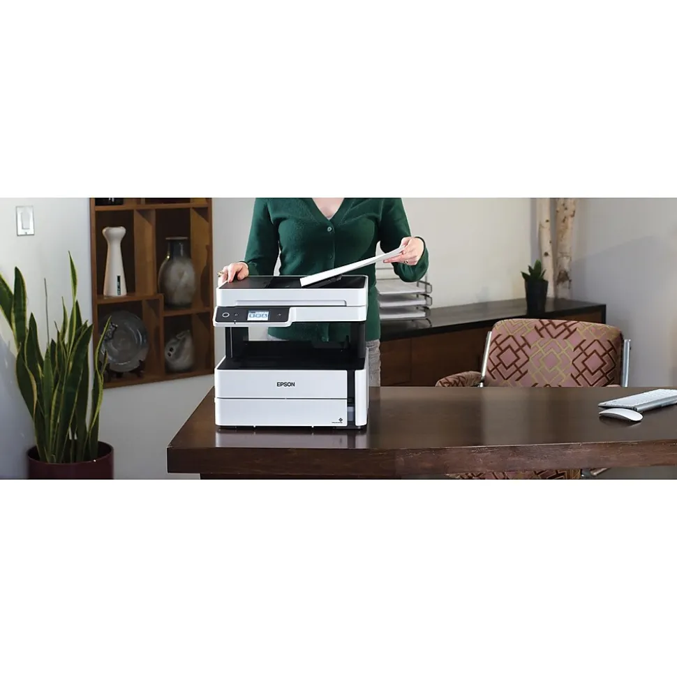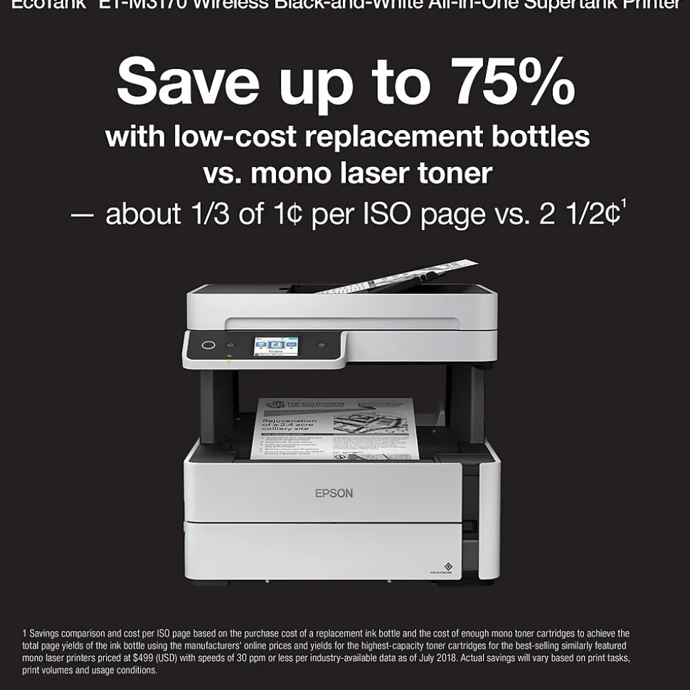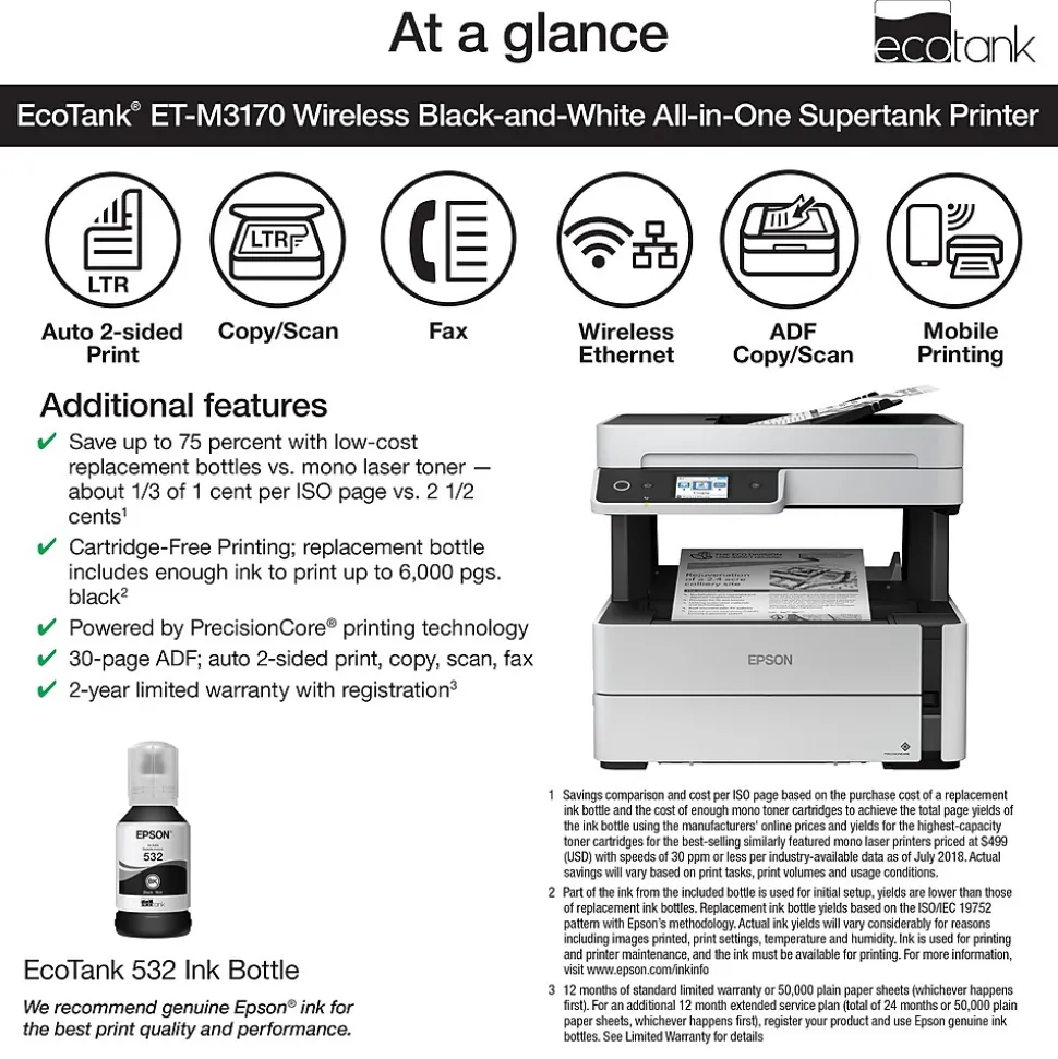 The EcoTank ET-M3170 monochrome supertank all-in-one printer, powered by PrecisionCore, offers worry-free, Cartridge-Free Printing with easy-to-fill, supersized ink tanks. Users save up to 75 percent with low-cost replacement bottles vs. mono laser toner — about 1/3 of 1 cent per ISO page vs. 2 ½ cents. The ET-M3170’s replacement ink bottle includes enough ink to print up to 6,000 pages. It features fast print speeds and a fast first page out. It also offers a 250-sheet paper tray, 35-page ADF, auto 2-sided printing, plus copying and scanning and wired and wireless networking. And, you save energy with lower power consumption vs. laser. And, it’s backed by a 2-year limited warranty with registration.