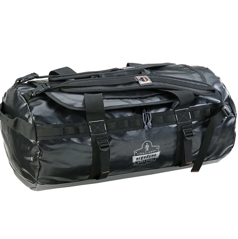 Ergodyne Arsenal 5020 Black large water resistant duffel bag contains heavy YKK zippers with flap for moisture protection and shoulder straps to carry as backpack. Bag also has mesh pocket under flap and 4 straps/2 handles for extra comfort.