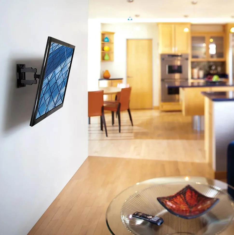 This low-profile full motion mount fits most 32″–63″ flat panel monitors and TVs up to 80 lbs (36.3 kg) and is well-suited for those applications where seamless integration counts most. Extruded aluminum construction provides maximum support in a lightweight TV wall mount. Its thoughtful design provides ample throw and nests the display centered on the wall.