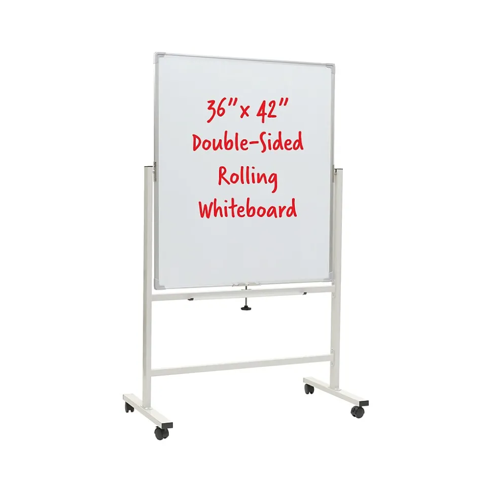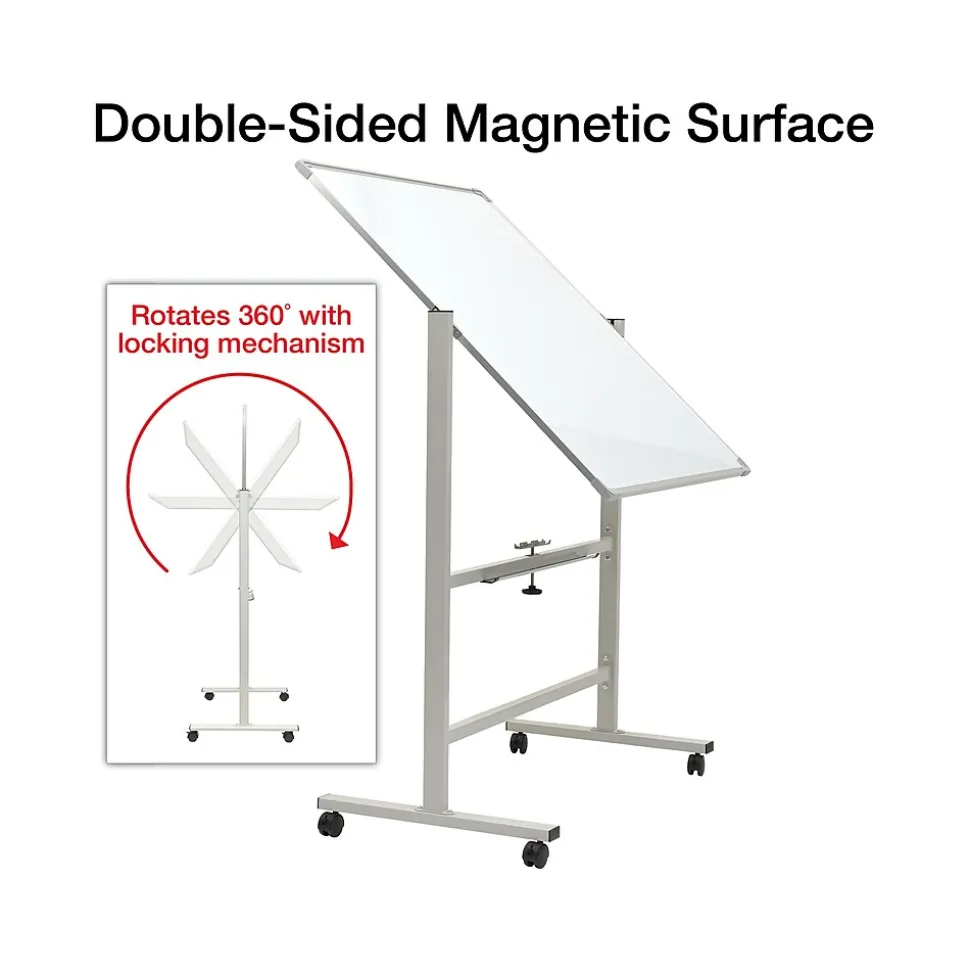The Excello Global Products magnetic dry-erase rotating whiteboard is built for brainstorming, teaching, or organizing ideas and information This magnetic dry-erase board doubles the writing space and delivers the durable mobility needed for dynamic workspaces. A slender yet sturdy steel frame provides a professional appearance, and rolling casters make it easy to move around a room.