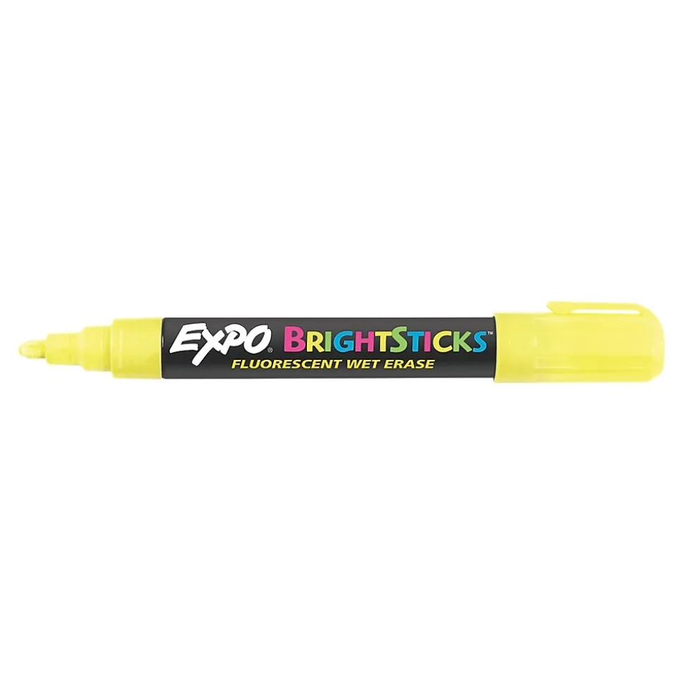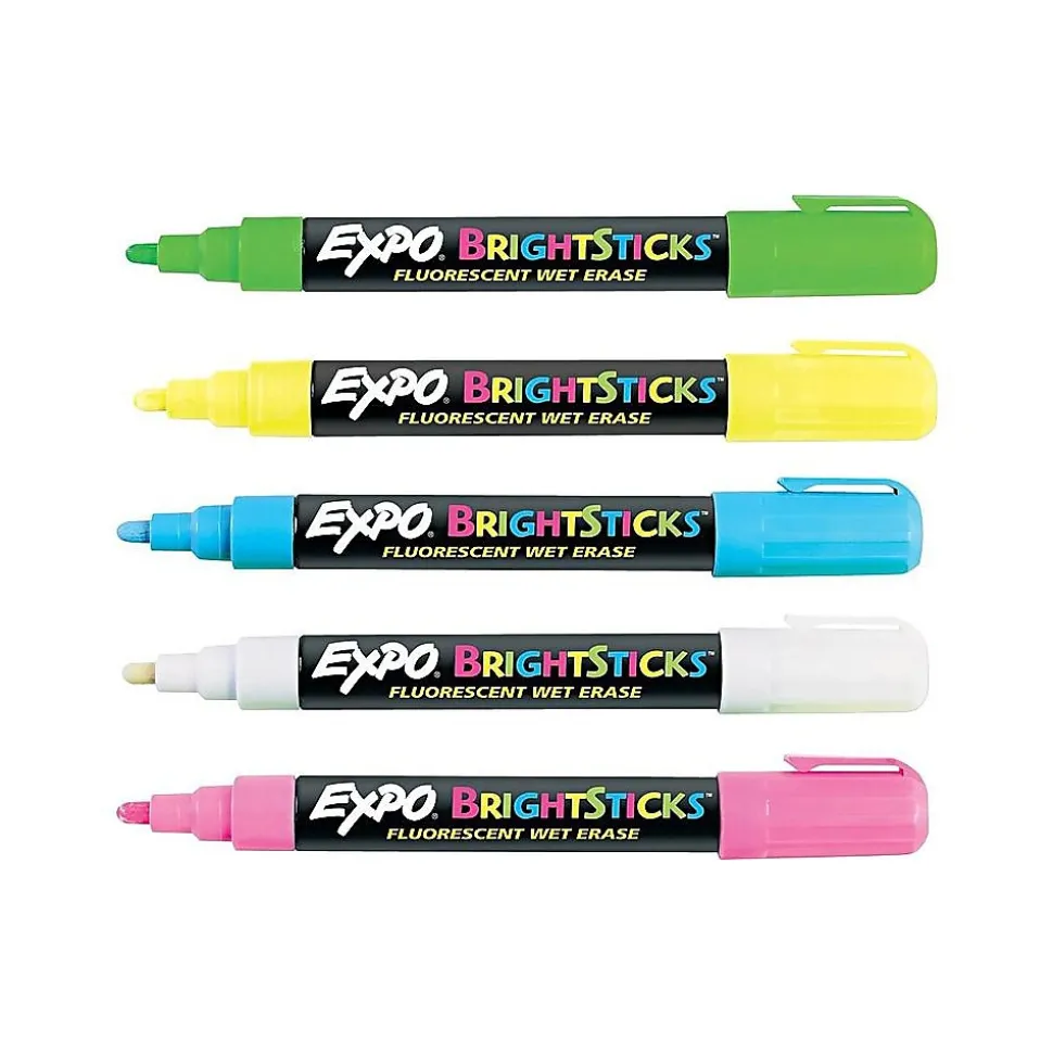 Create bright, visible text or drawings that catch people’s attention in restaurants, stores, or schools with these fluorescent wet-erase markers. These quick-drying, non-toxic markers work on glass, black marker boards, and UV-light boards, wiping right off with a wet cloth. This pack includes five assorted colors of Expo BrightSticks fluorescent wet-erase markers featuring bullet nibs for bold and uniform writing.
