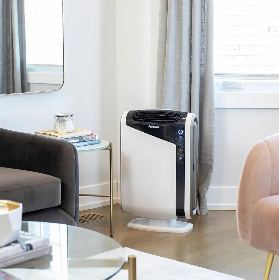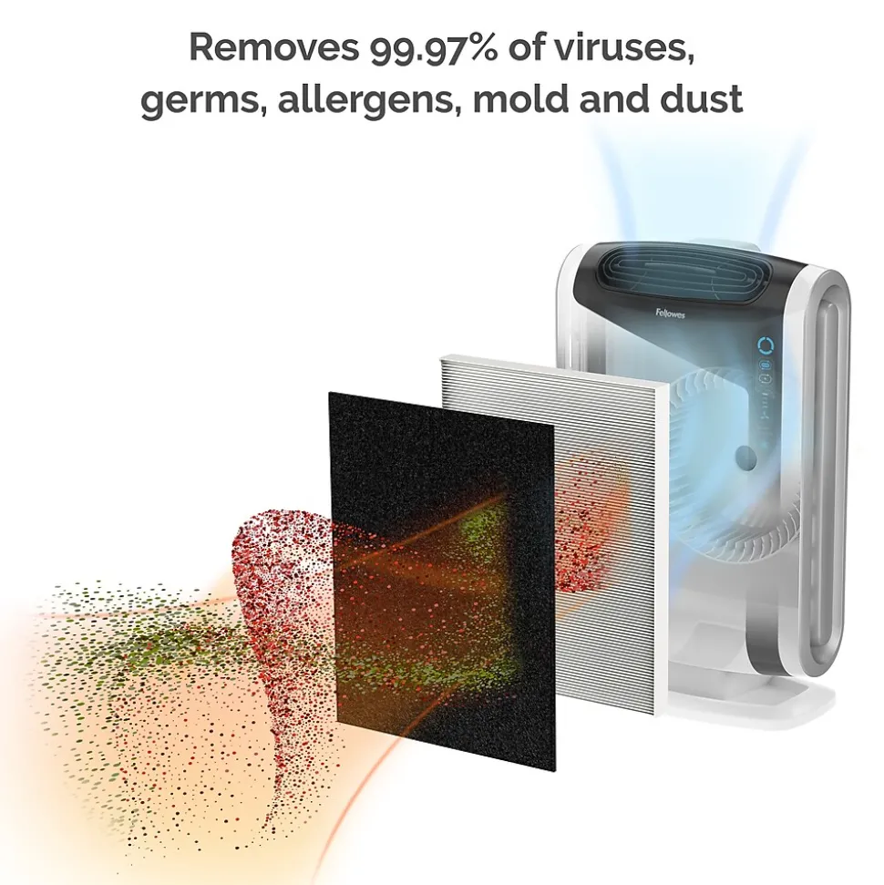 The Fellowes® AeraMax® DX95 Air Purifier uses 4-stage hospital-type filtration to effectively purify air in large rooms 300 – 600 square feet. The AeraSmart™ Sensor monitors the air quality and automatically adjusts the fan speed to keep your air purifiedwith ultra-quiet operation. A True HEPA filter with AeraSafe™ antimicrobial treatment safely removes 99.97% of airborne particles as small as 0.3 microns. Backed by a 3-year manufacturer limited warranty.