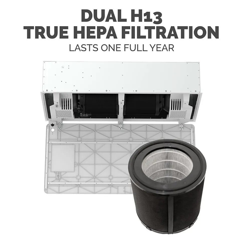 - Filtration with H13 True HEPA captures up to 99.95% of particles as small as 0.1 microns, including viruses, allergens, and germs