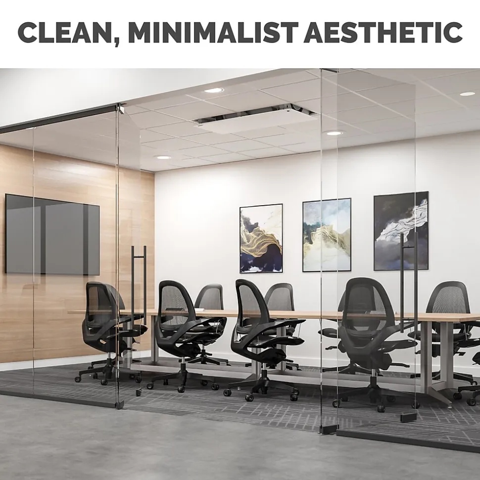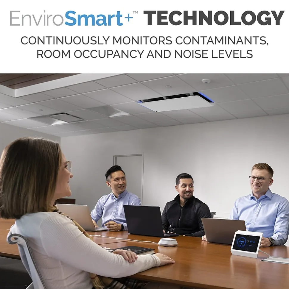Inconspicuous and integrating beautifully with the majority of standard grid ceiling systems, the Fellowes Array AR2 three-in-one filter (prefilter, carbon, and H13 True HEPA filtration) is 99.95% effective in capturing molecules as small as 0.1 microns, including viruses, allergens and germs, and is designed to last for 1 full year. This recess unit’s energy-efficient design includes a unique mixed-flow fan by Fellowes, designed to maximize air flow while delivering quiet operation. EnviroSmart+ technology includes a full suite of comfort and control sensors to continuously monitor contaminants, room occupancy, and noise levels to proactively respond to changes. This suite of indoor air quality (IAQ) sensors includes particulates (PM10, PM2.5), occupancy, temperature, humidity (rH), carbon dioxide (CO2), pressure, and TVOCs.