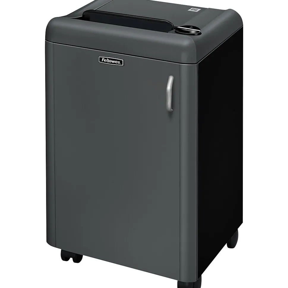 Fellowes Fortishred™ Continuous-duty shredder in gray/black color measures 11-3/4″ x 15-1/2″ x 11-3/4″ and provides high throughput of 64. Shredder has motor power of 0.5 hp and shreds 34 sheets into 3/100″ x 1/5″ size with high security cross-cut.