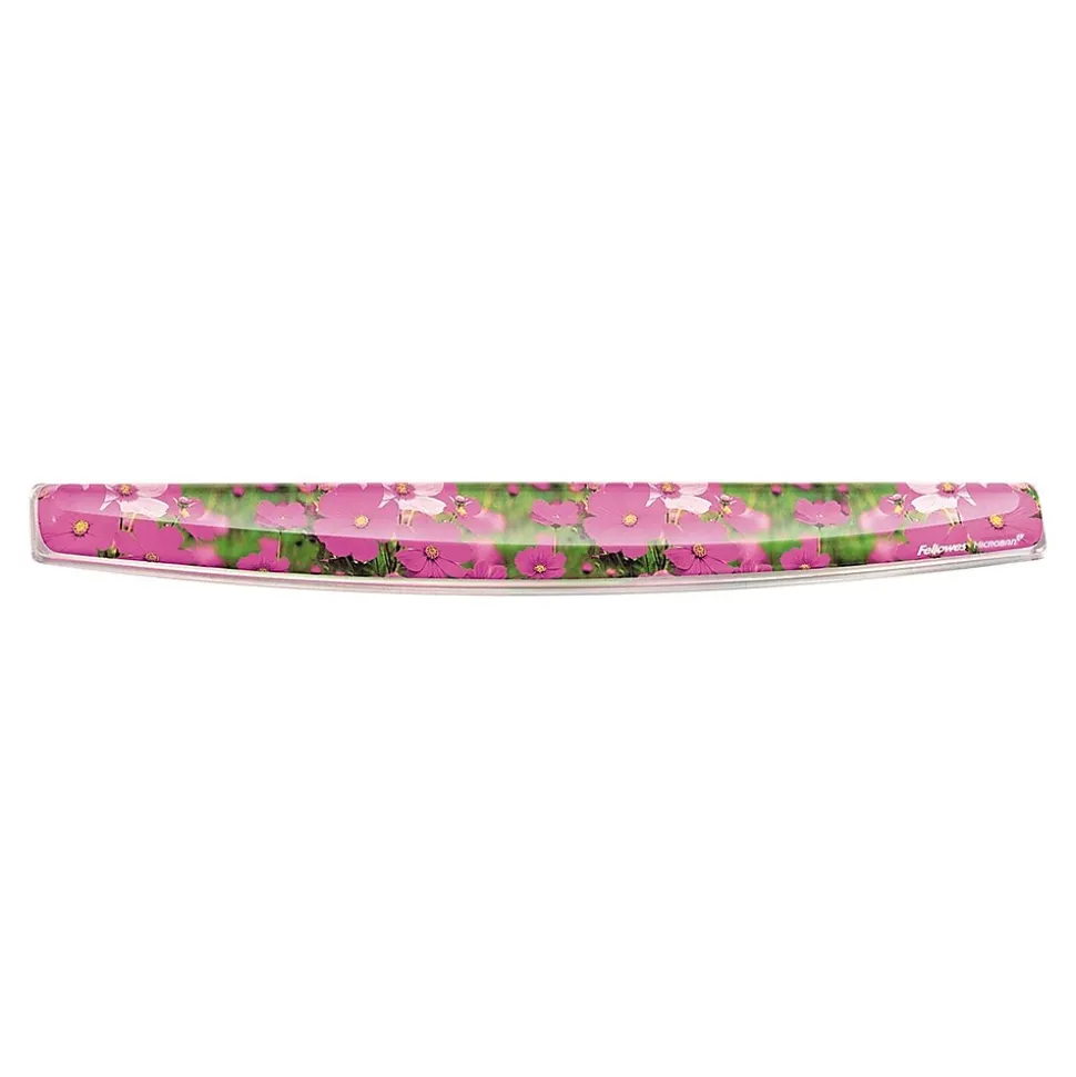 Keep your wrist aligned and express your style with this flower photo gel keyboard wrist support.The Fellowes Photo Gel ergonomic 9179101 keyboard wrist rest in pink flowers print, uses self-adjusting gel to provide superior comfort and softness to help in relieving wrist pressure. The MICROBAN antimicrobial product protection ensures cleanliness and safety. The stain-resistant polyurethane covering is easy to clean. The non-skid rubber backing keeps the pad in place.