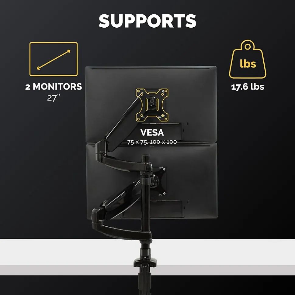 - SUPPORTS: Supports dual monitors up to 27″ (stacking) and 32″(side by side) and 17.6 lbs. each, perfect for home, office, or gaming setups.