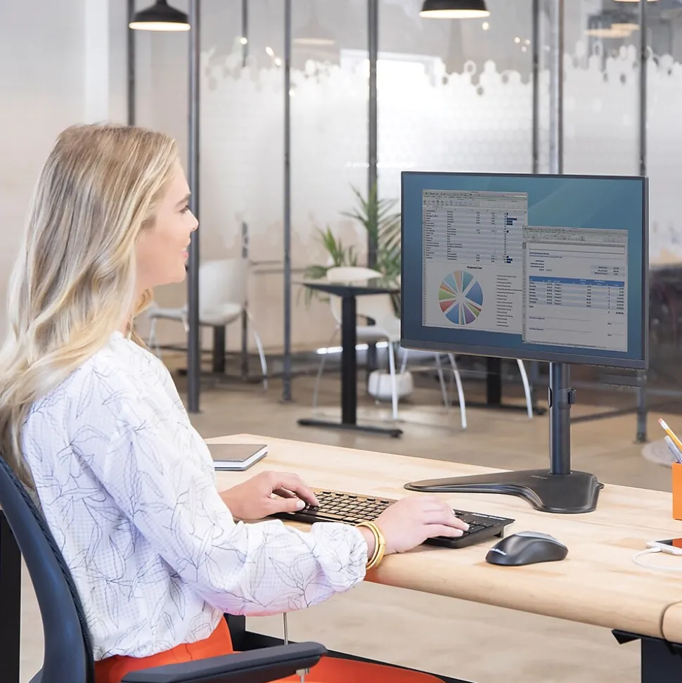 Fellowes Professional adjustable monitor arm is designed for optimal viewing control, while the cable management system minimizes clutter.