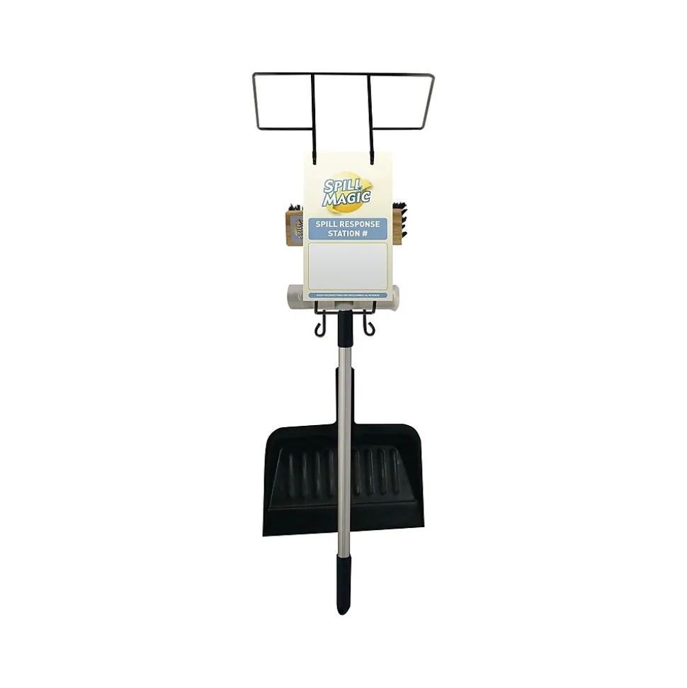 The First Aid Only Spill Magic mountable wire rack spill response station holds everything needed to quickly respond to a spill. The system includes a broom with 40″ telescoping handle, clip-on dustpan, and a trash liner roll.
