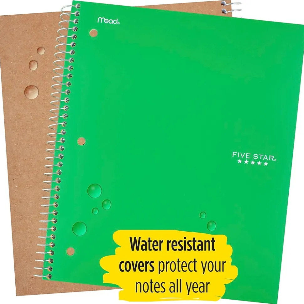 Mead® Five Star® Wirebound notebook in green color features durable plastic front cover and coated natural Kraft back cover. Notebook with 3-hole punched has 2-Pocket dividers to store loose papers and contains 100 pages.