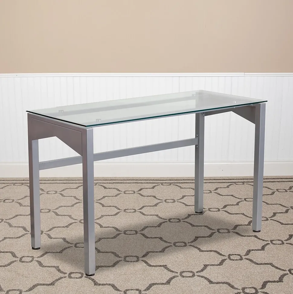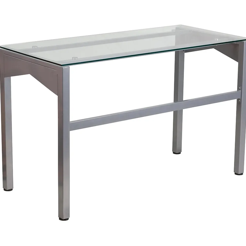 This desk features a clear, tempered glass surface supported by an industrial style, silver powder coated frame with geometric accents on the sides. The generously sized desktop allows you to efficiently manage your workload, while providing ample room for your favorite desk chair. A supportive brace across the rear legs reinforces the frame and complements the stylish lines of the design. Plastic floor glides protect your floors by sliding smoothly when you need to move the desk.