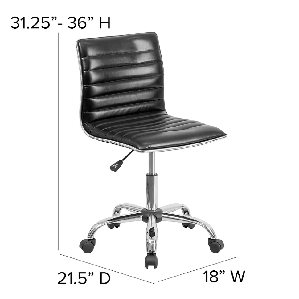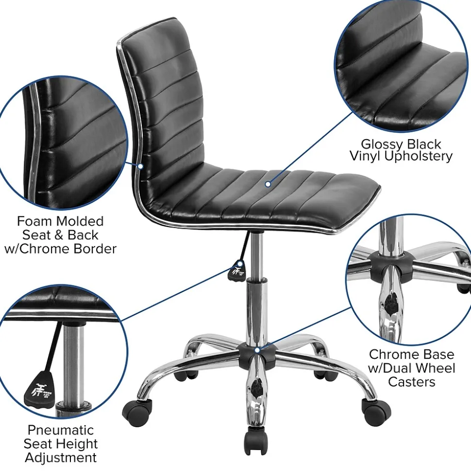 Modern accents and a sleek profile make this ribbed office task chair a perfect addition to your office. A streamlined silhouette combined with the armless design can breathe new life into a small workspace and not only allows room for more board members, clients or visitors but also permits you to roll further under a desk or table. The glossy black vinyl upholstery with a chrome metal border paired with a matching chrome frame and base gives an up-market feel to any professional space. The low back design and foam molded seat and back provide lower back support. A pneumatic seat height adjustment lever lets you easily position the chair while the 360° swivel gives you access to all of your work surfaces. This sturdy task chair has a heavy duty, 5-star chrome base with dual-wheel casters. Spills clean up easily with water followed by a dry cloth.