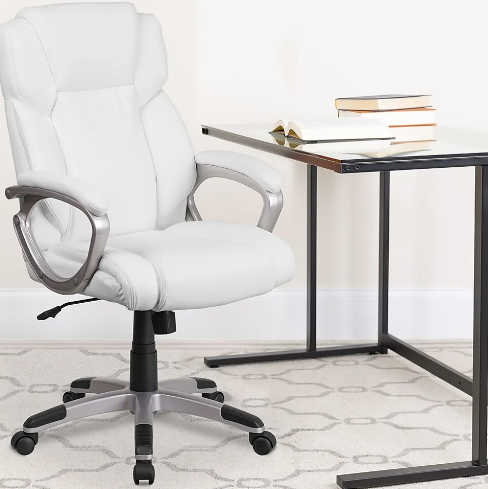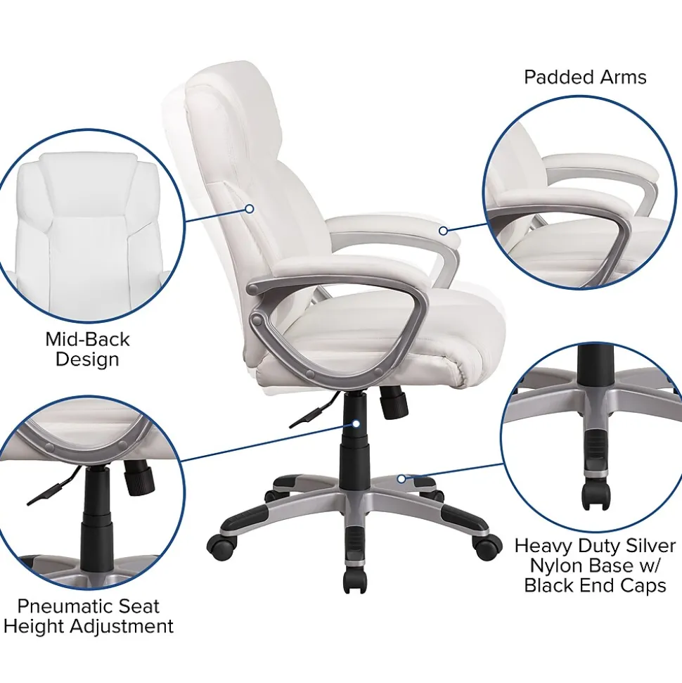 When impeccable form follows precise function the result is this black executive LeatherSoft office chair that offers a stylish appearance as well as custom comfort. The mid-back design provides support to the mid-to-upper back region. LeatherSoft is leather and polyurethane for added Softness and Durability. Turn the tilt tension adjustment knob to increase or decrease the amount of force needed to rock or recline. Lock the seat in place with the tilt lock mechanism. The waterfall front seat edge removes pressure from the lower legs and improves circulation. Chair easily swivels 360 degrees to get the maximum use of your workspace without strain. The pneumatic adjustment lever will allow you to easily adjust the seat to your desired height. The silver nylon base with black caps prevents feet from slipping when resting on chairs base. This chair will be an outstanding work from home or office chair.