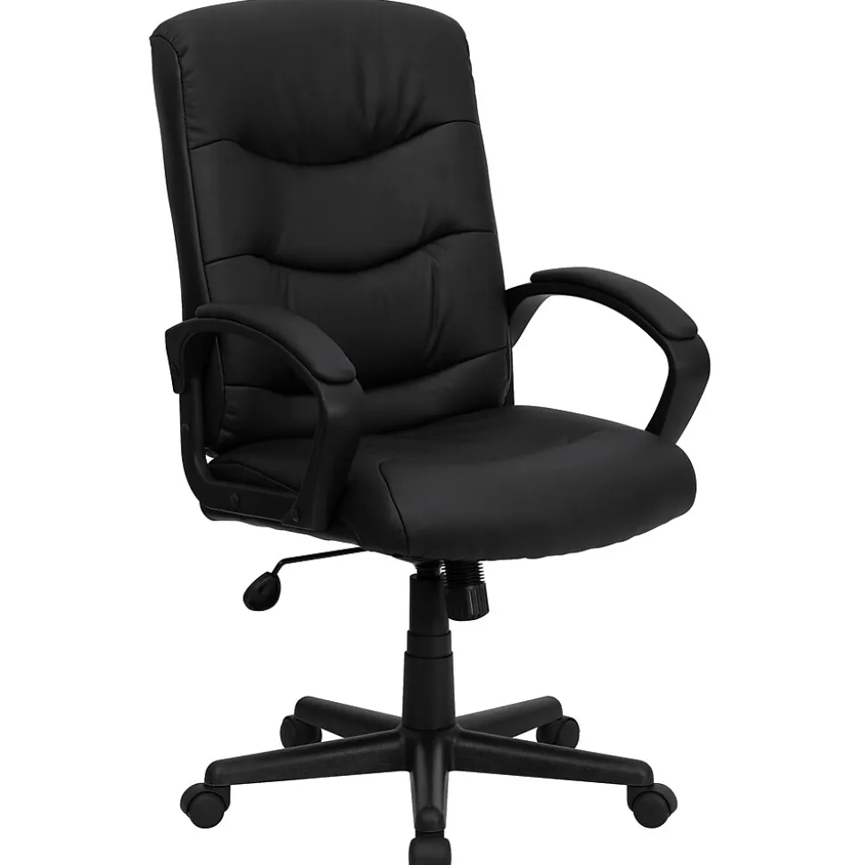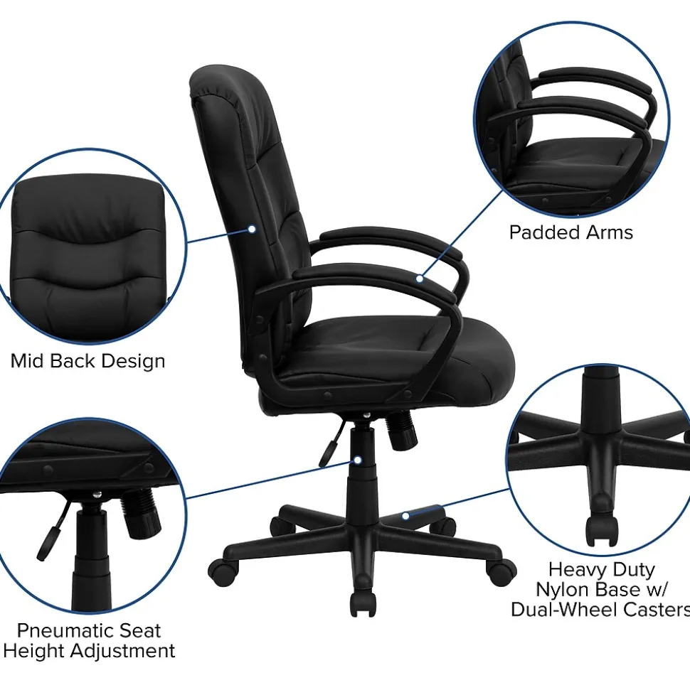 Upgrade your office seating with this mid-back black LeatherSoft upholstered swivel task office chair. A mid-back office chair offers support to the mid-to-upper back region. Chair easily swivels 360 degrees to get the maximum use of your workspace without strain. LeatherSoft is leather and polyurethane for softness and durability. The tilt lock mechanism rocks/tilts the chair and locks in an upright position while the tilt tension adjustment knob adjusts the chair’s backward tilt resistance. The pneumatic adjustment lever will allow you to easily adjust the seat to your desired height. This computer chair is perfect for the office or in the home. From behind the desk to the meeting room this chair can provide a seamless addition to your work space.
