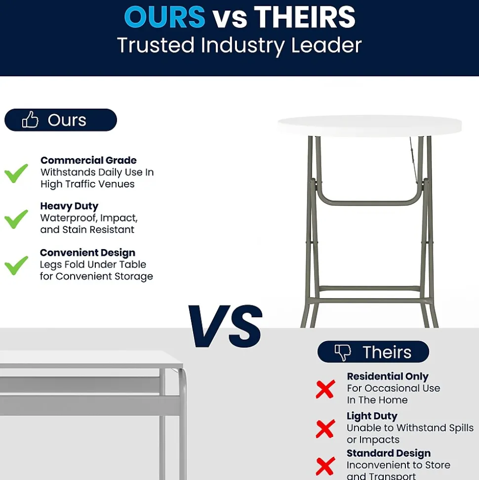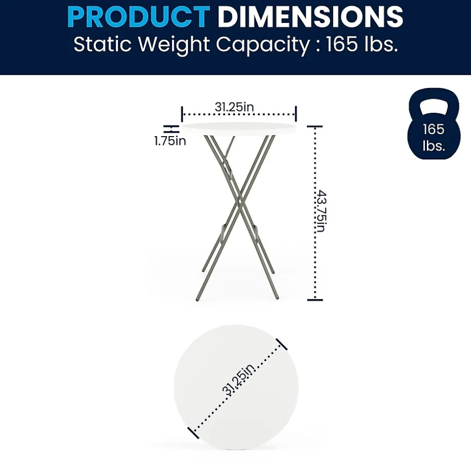 When you need a little extra surface area this folding bar height table is the perfect choice. This plastic folding table is a convenient option when you need to set up tables for special events, cook-outs on your patio at home or when you’re serving snacks around the pool. Use during events as a mixing bar and pair with table height tables for a touch of elegance. This durable, easy to clean table is commercial rated for use in banquet halls, convention centers and at trade shows. The thick, granite white tabletop is 1.75″ thick, and will comfortably seat up to 3 adults. Its waterproof, impact and stain resistant top have a 165 pound static load capacity. Non-Locking bar height gray powder coated cross legs fold to transport and store. Non-marring floor caps protect your floor by sliding smoothly when you need to move it. The 32″ Round Granite White Plastic Bar Height Folding Table is a convenient option for your next home, school or business event. Designed for both indoor and outdoor use, store table indoors and protect the frame from extreme moisture.