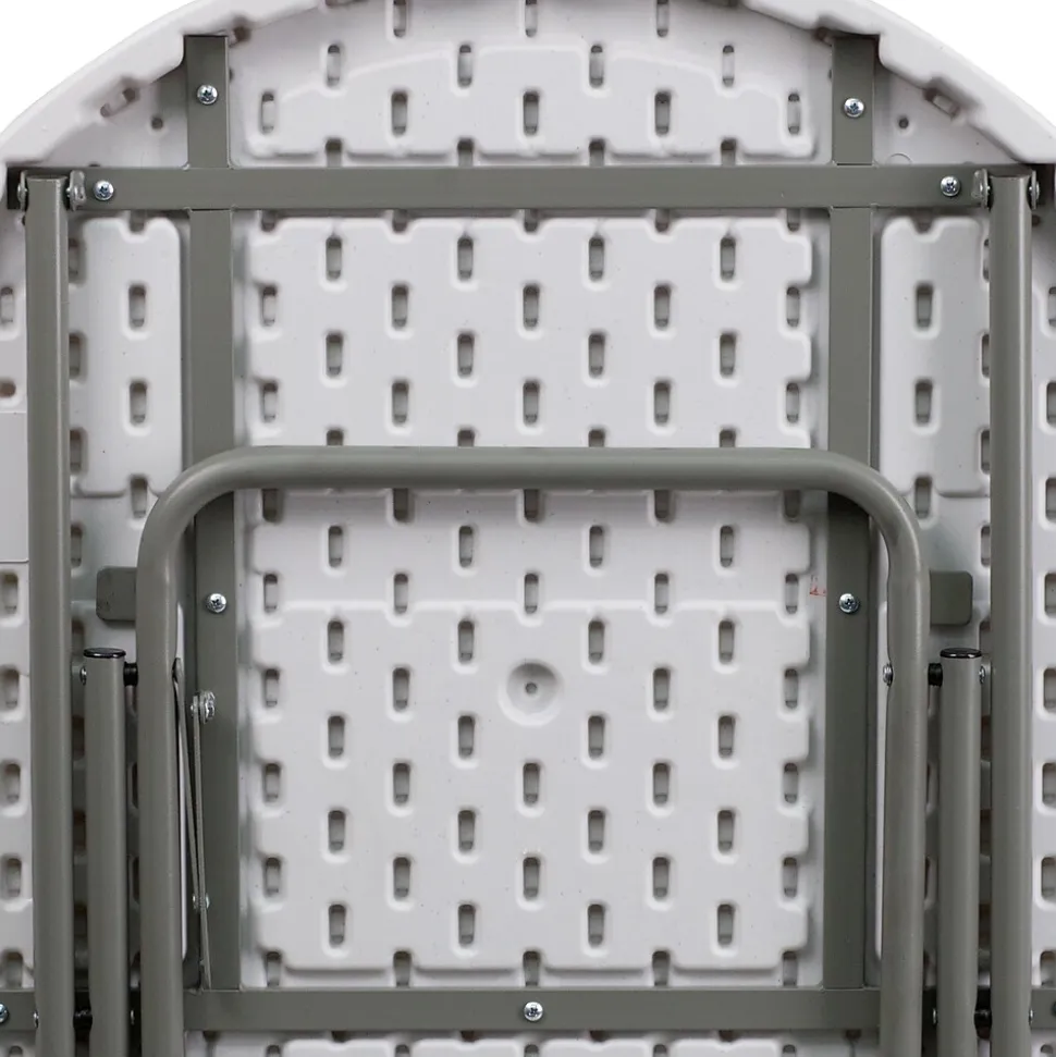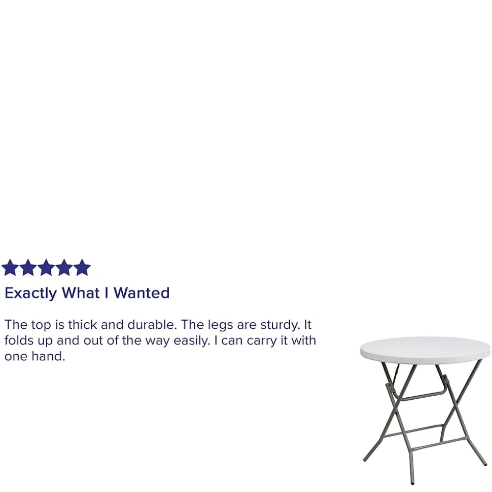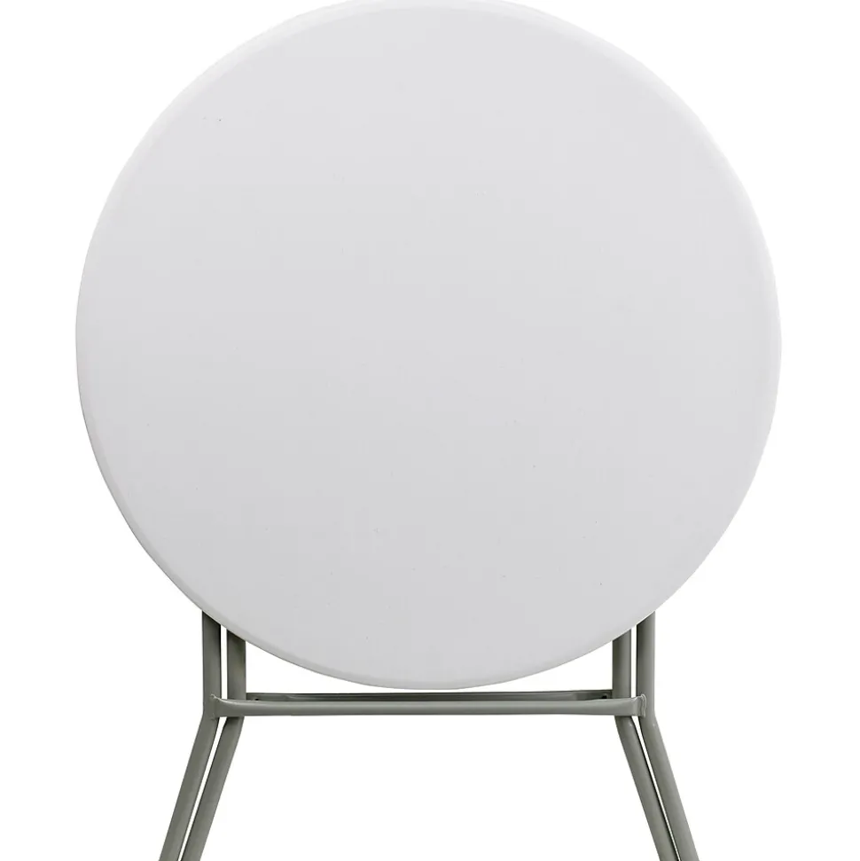 When you need a little extra surface area this folding table is the perfect choice. This plastic folding table is a convenient option when you need to set up tables for special events, cook-outs on your patio at home or when you’re serving snacks around the pool. This durable, easy to clean table is commercial rated for use in banquet halls, convention centers and at trade shows. The thick, granite white tabletop is 1.75″ thick, and will comfortably seat up to 3 adults. Its waterproof, impact and stain resistant top have a 220 pound static load capacity. Non-Locking gray powder coated cross legs fold to transport and store. Non-marring floor caps protect your floor by sliding smoothly when you need to move it. The 32″ Round Granite White Plastic Folding Table is a convenient option for your next home, school or business event. Designed for both indoor and outdoor use, store table indoors and protect the frame from extreme moisture.