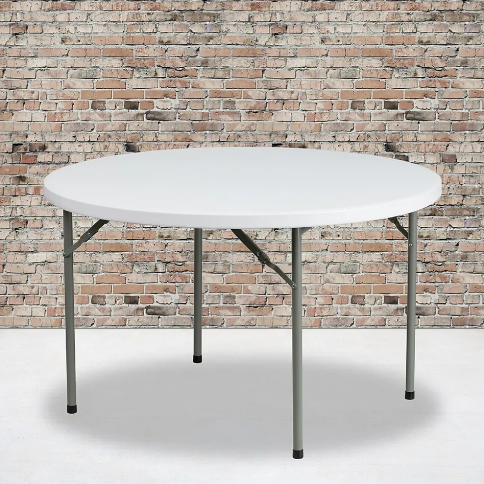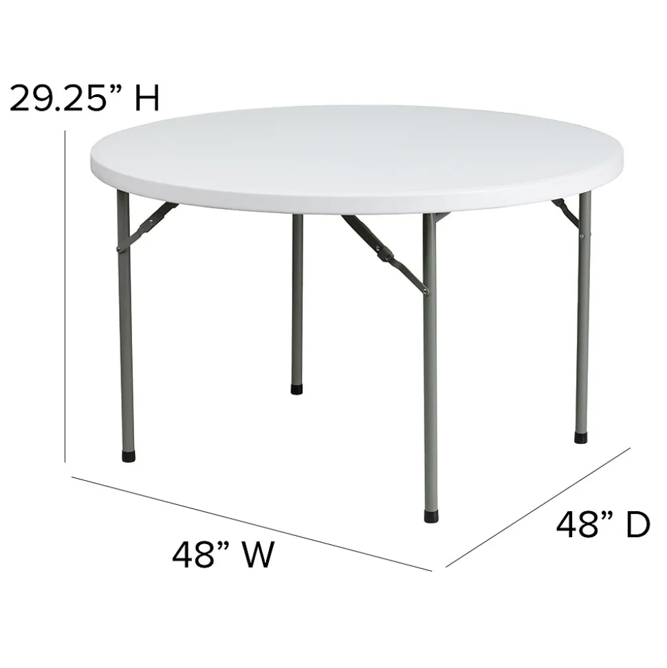 Ensure you have enough surface space for any function and take the stress out of hosting your next gathering. The round dining folding table is a great option for special event planners, catering companies and banquet facilities. This durable, easy to clean table is commercial rated for use in banquet halls, convention centers and at trade shows. Use during game night, dress it up for holiday parties, and coordinate crafts night. The thick, granite white tabletop is 4′ in diameter, 1.5″ thick, and will comfortably seat up to 6 adults. Its waterproof, impact and stain resistant top have a 500 pound static load capacity. Attractive gray powder coated legs lock securely in place while in use and non-marring floor caps protect your floor by sliding smoothly when you need to move the table. Designed for both indoor and outdoor use, store table indoors and protect the frame from extreme moisture. The 48″ Round Granite White Plastic Folding Table is a convenient option for your next home, school or business event.
