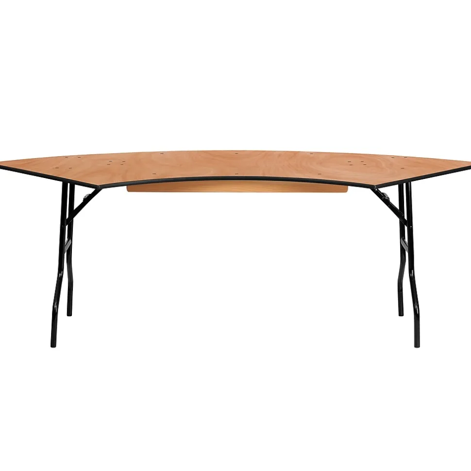 This semi-circular wood folding table allows you to create a serpentine, half circle or full circle table. The serpentine table allows you to create beautiful arrangements for weddings, banquets and other events. Create a serpentine table by placing two tables in alternate directions. Create a half circle or full circle by placing two or four tables together from end-to-end. The table legs fold under the table to make storage more convenient and for better portability. This table is commercial grade to withstand everyday use in the hospitality industry.