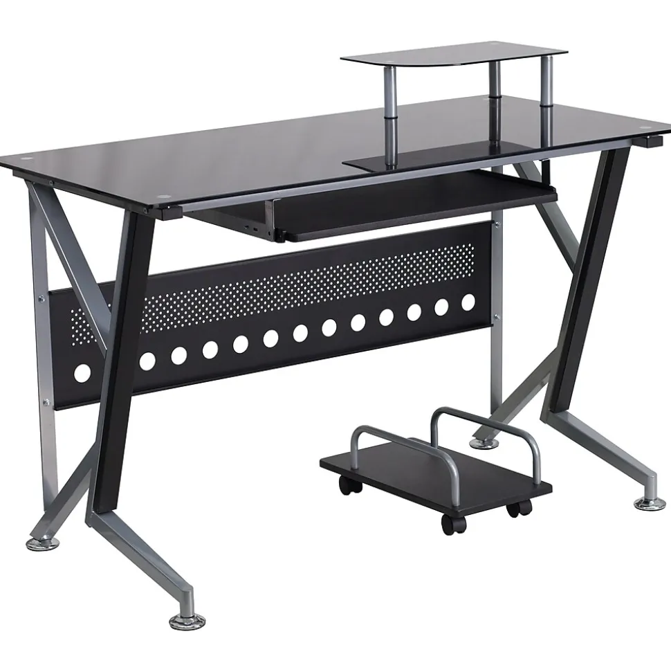 This computer station offers a modern touch with black glass surfaces. Investing in a desk for your home makes working from home or managing household bills and paperwork a nicer experience. The raised monitor shelf gives you more work space for your pa perwork and writing utensils. The pull-out keyboard platform can store your keyboard away when no longer needed for a clean appearance. This desk also features a privacy panel and a convenient CPU cart so you can place it where it suits your needs.