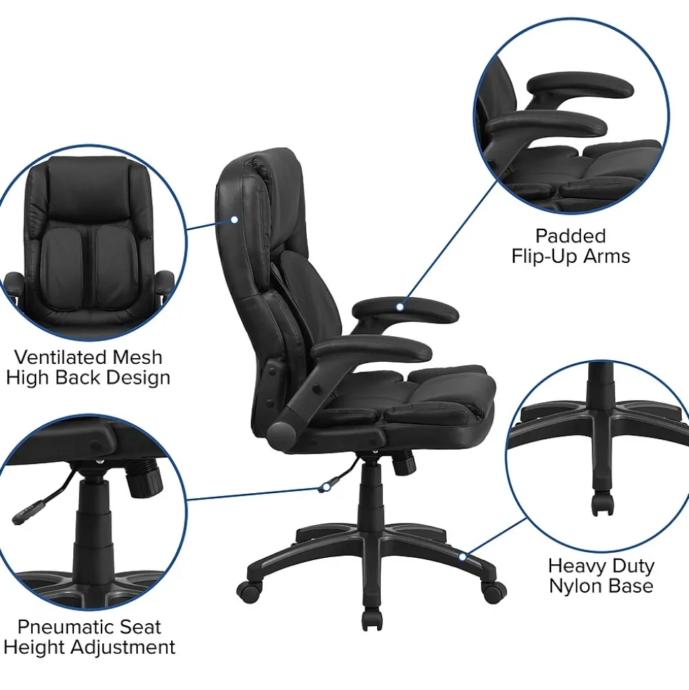 Finding a comfortable chair is essential when sitting for long periods of time. This contemporary office chair features outer lumbar supports that provide excellent back support. Having the support of an ergonomic office chair may help promote good posture and reduce future back problems or pain. High back office chairs extend to the upper back for greater support. The high back design relieves tension in the lower back, preventing long term strain. The tilt lock mechanism rocks/tilts the chair and locks in an upright position while the tilt tension adjustment knob adjusts the chair’s backward tilt resistance. Chair easily swivels 360 degrees to get the maximum use of your workspace without strain. The pneumatic adjustment lever will allow you to easily adjust the seat to your desired height. The flip-up arms are great for users who like the option of an armless chair without the hassle of detaching them.