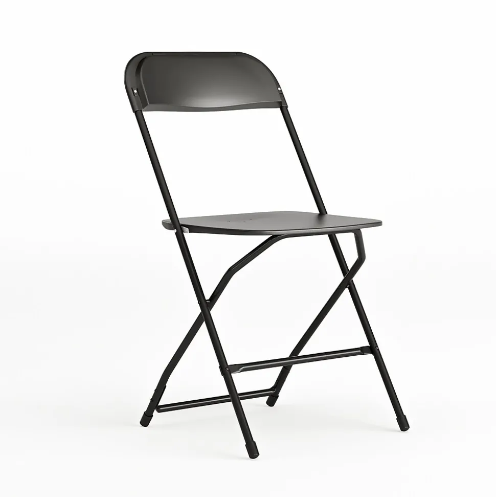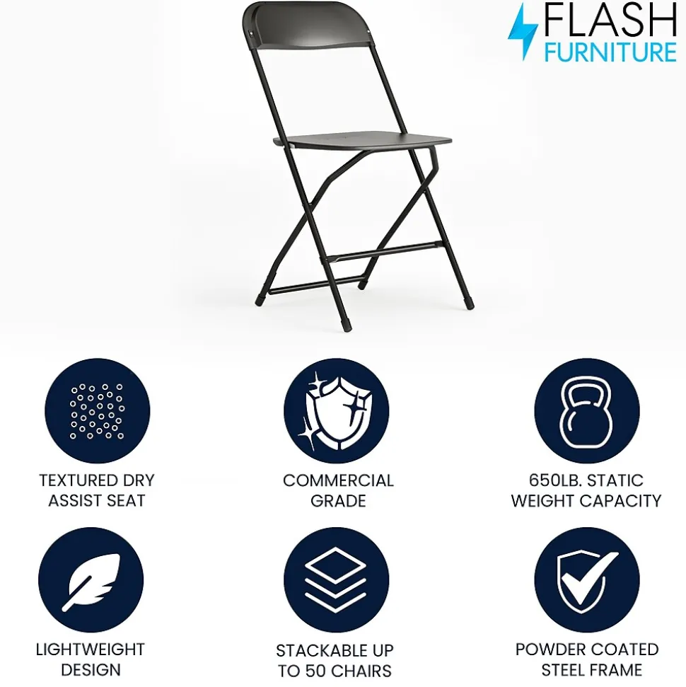 Commercial-grade plastic folding chairs designed to be lightweight but durable. This product is engineered and built with premium materials that will withstand heavy duty use for event, business and home usage. These folding chairs will nest easily to stack 50 high from the floor and feature a textured contoured plastic seat for the highest level of comfort and security. With a variety of color options you can choose what would best pair with your event needs. This is a commercial-grade on-demand seating solution convenient for weddings, school functions, barbecues, game night, and catering events. Stay comfortable during social events with the gentle contour shaped seat and back. Folding chair highlights: – Ready-to-use with no assembly required – Hassle free stackable storage – Textured seat designed for maximum comfort and security – Floor caps to prevent surface and flooring damage – 650LB weight capacity These low-maintenance party event chairs wipe down easily after luncheons and stack neatly for storage or floor maintenance. Make a smart investment by purchasing multiple plastic folding chairs for your rental business, waiting room or corporate training rooms. Purchase our folding chair truck for quick and easy set up and take down.