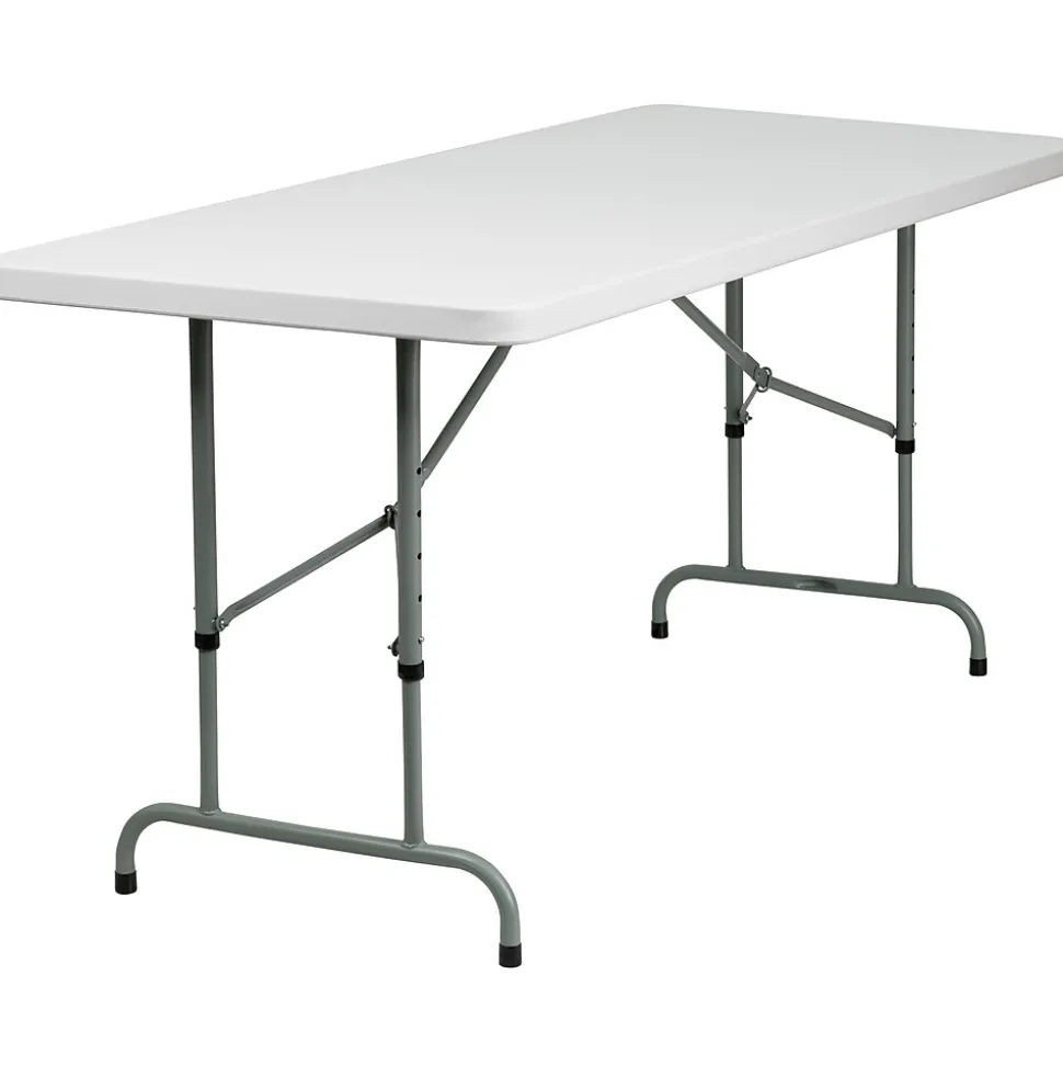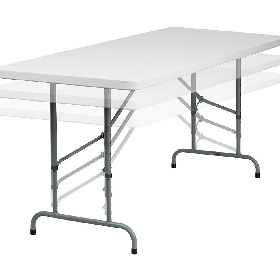 If you need an accommodating table for extra guests and your creative projects a folding table is perfect. This 6′ long banquet folding table adjusts to meet different seat heights. Built for commercial use this heavy-duty folding table makes appearances in restaurants, warehouses, schools, churches and rec centers. Folding tables can be used for all your sit-down activities and their legs lock when folded for storage. This versatile folding table can be dressed up during holiday events and parties. If you have hard flooring at your banquet hall the floor caps prevent scratches and glide smoothly across floors. Easy to clean and store, plastic folding tables are the best option for any occasion. Although designed for indoor events this party table can be used outdoors on the patio during good weather but must be stored indoors. Get your ready to use rectangular folding table for your home or business today.