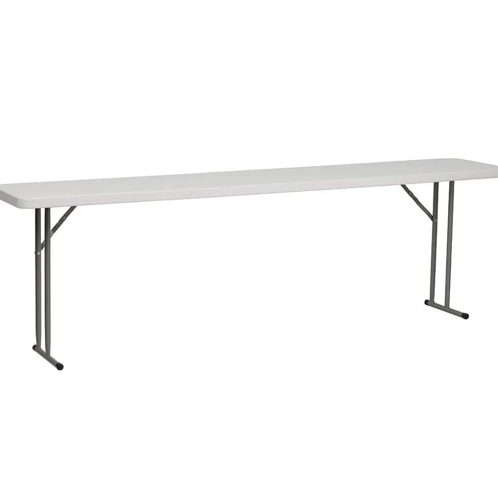 Fill that new designated training room with this narrow rectangular plastic folding table. The space saving design can fit multiple tables in small and large rooms making it the perfect training style table for any classroom or training facility. Have people pick up test packets and informational pamphlets on this perfectly sized folding table. Cleanup is simple on this durable, waterproof top to pick up spills quickly. This 8 foot folding table seats 4 people on one side of the table allowing all at the table a clear view of the board and instructor. When you want to store or transport the legs lock underneath the top. Folding tables can be your go-to table to setup your products at convention centers.