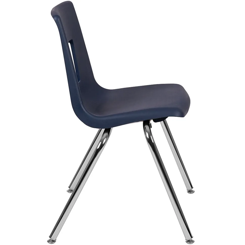 The classroom oriented student stack school chair features a heavy-duty navy seat shell made of superior high-density polypropylene, ergonomically shaped for maximum student seating comfort and 18-gauge bright nickel, chrome plated frame. The seat shell is designed to promote student seating comfort and correct seating posture for enhanced learning. Non-exposed rivets hold the school chair shell to the strong, non-corrosive steel frame while nylon tip glides on each leg help protect delicate floor surfaces. This ergonomic stack chair provides a stylish and durable classroom seating solution.