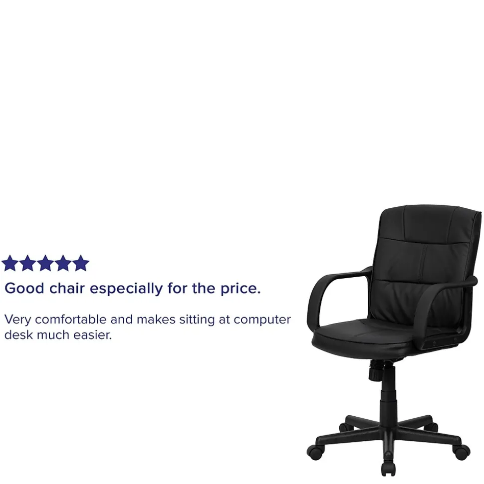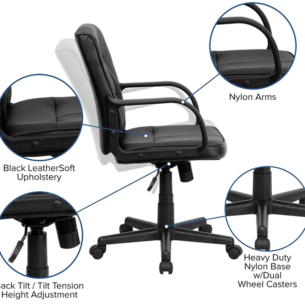 Create a visually appealing look in your office or reception area with this LeatherSoft upholstered, swivel office chair with arms. Mid-back office chairs are a great choice for workspaces where space may be tight, allowing you to move from one desk to another. A mid-back office chair offers support to the mid-to-upper back region prompting you to sit straight. Chair easily swivels 360 degrees to get the maximum use of your workspace without strain. A full range of adjustable features help your employees change the feel of this chair to meet their own personal preferences. With a spring tilt control mechanism, tilt tension control knob, upright tilt lock, and pneumatic seat height adjustment, this chair can be adjusted to fit each employee.
