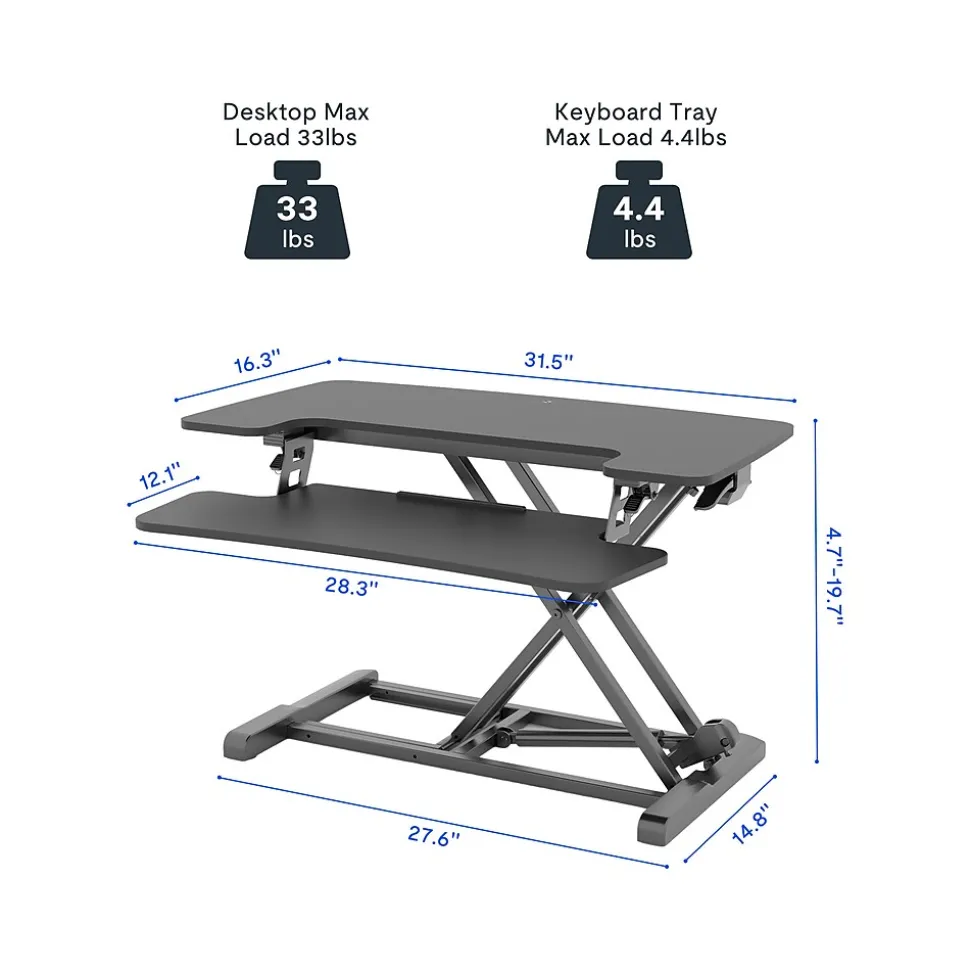 - Features a spacious two-tier working space: large 31.5″ x 16.3″ surface (weight capacity up to 33 lbs.) and 28.3″ x 12.1″ detachable keyboard tray with a weight capacity of 4.4 lbs.