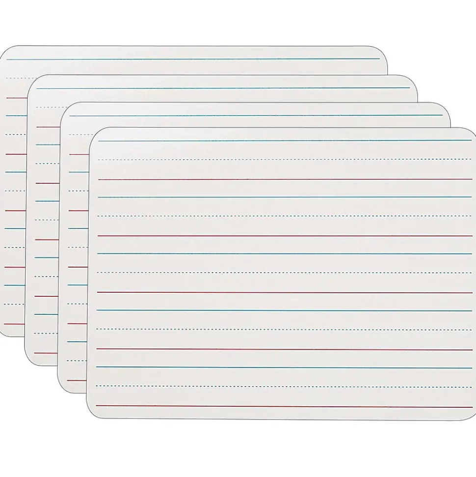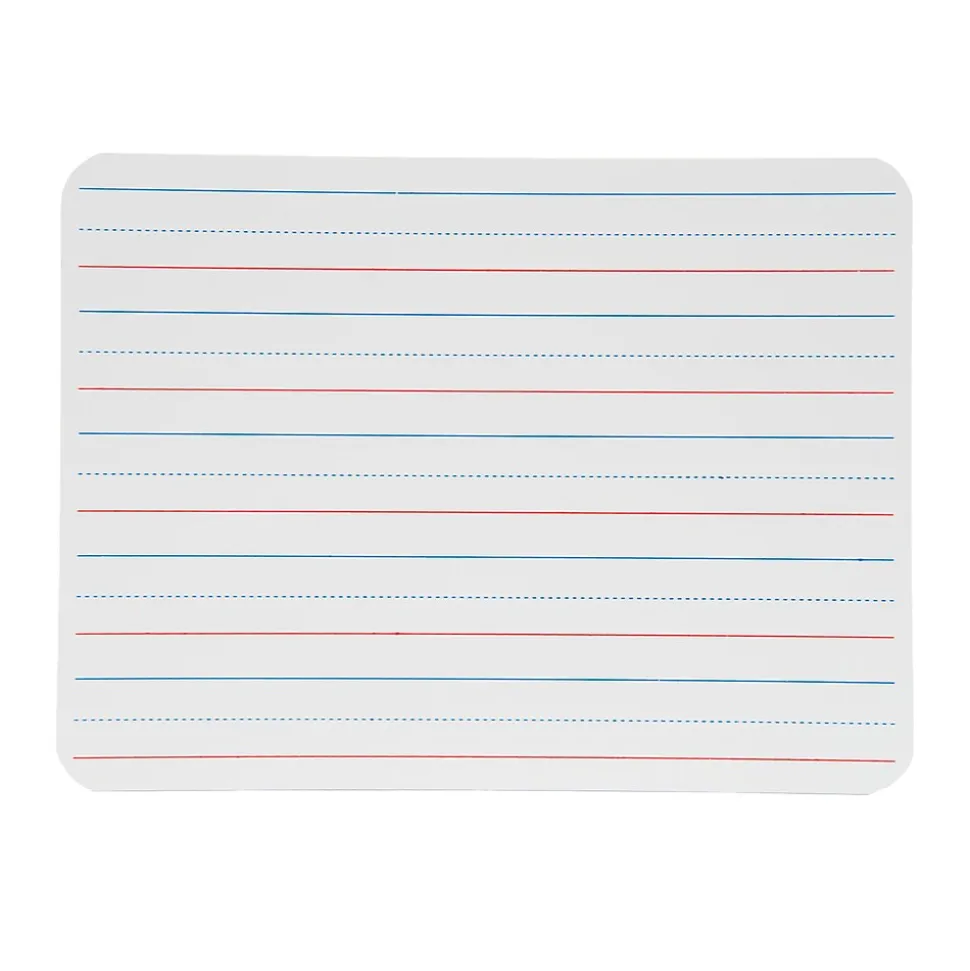 Two-sided red & blue ruled dry erase boards are great for teaching and practicing fundamentals at the early learner stage. Bright white board contains 5 sets of blue headline and broken mid-line plus red baseline format. Each line set measures 1-1/8″ with 3/8″ of blank descender space between sets. Back side is plain white dry erase. Boards feature a high-quality, non-ghosting write-and-wipe surface with smooth, rounded edges and corners. Hardboard backing will not warp or chip. Measure 12″ x 9″ x 0.125″ thick. Sold as a pack of 4.