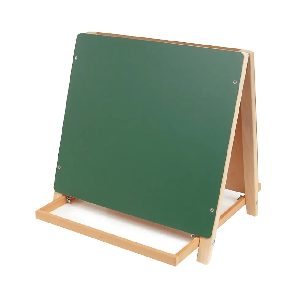 Designed for tabletop use, this easel features a white dry-erase surface on one side and a green chalkboard on the reverse. A large center tray provides useful storage space.