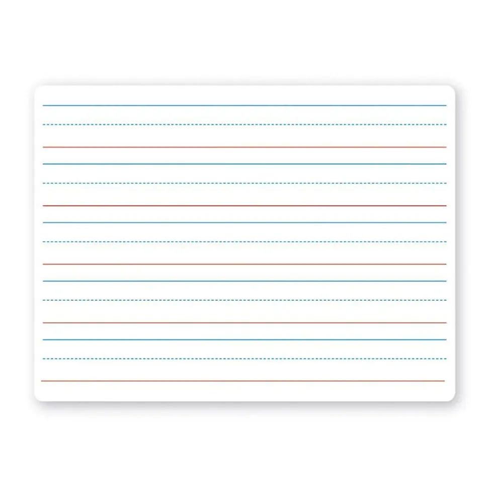 The two-sided red and blue ruled dry-erase board is great for teaching and practicing fundamentals at the early learning stage. This bright whiteboard contains five sets of blue headline and broken mid-line plus red baseline format. Each line set measures 1.13″ with 0.38″ of blank descender space between sets. Back side is plain white dry-erase. The board features a high-quality, non-ghosting write-and-wipe surface with smooth, rounded edges and corners. Hardboard backing will not warp or chip.