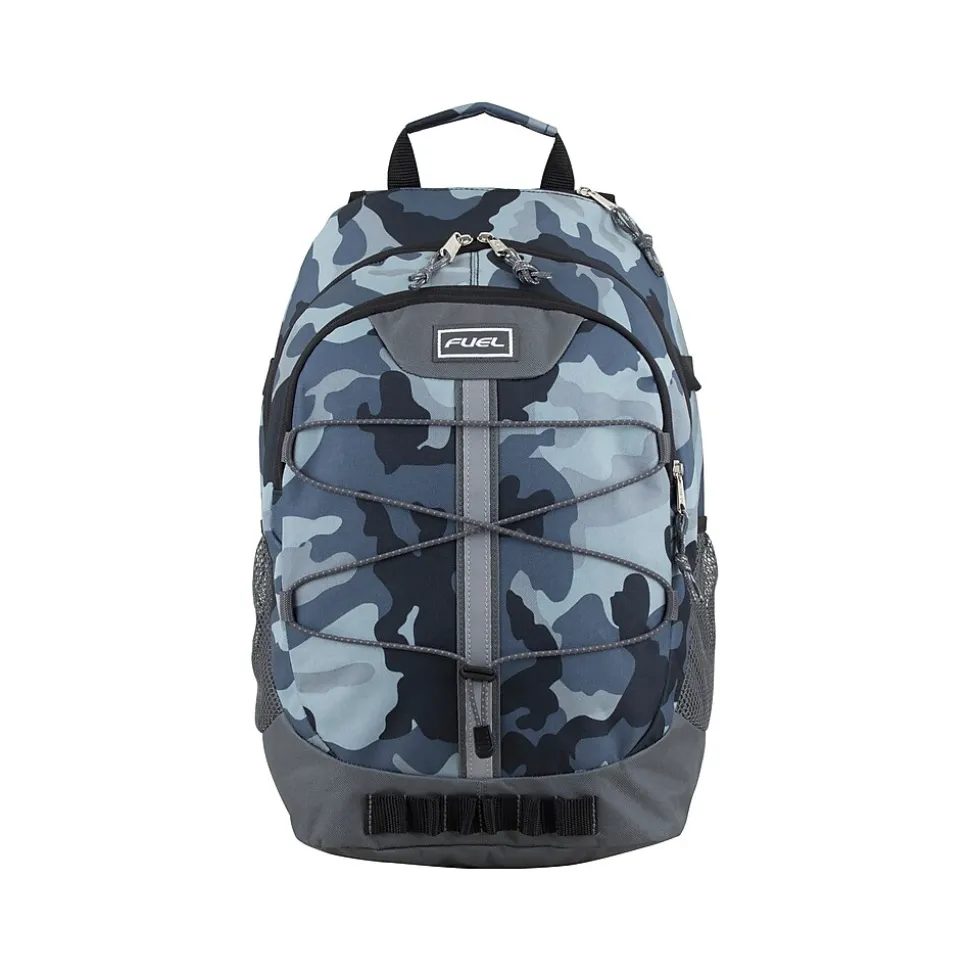 The FUEL Terra Sport Bungee backpack features a large double-zip compartment with padded laptop sleeve, smaller zip compartment, quick-access felt-lined electronic/sunglasses pocket, twin side water bottle pockets, front bungee with reflective safety strip, daisy chain accents, ergo foam padded back, and shoulder straps. The water-resistant heavy-duty 420D nylon construction holds up to the elements, making this durable backpack perfect for school, sports, and any outdoor activities.