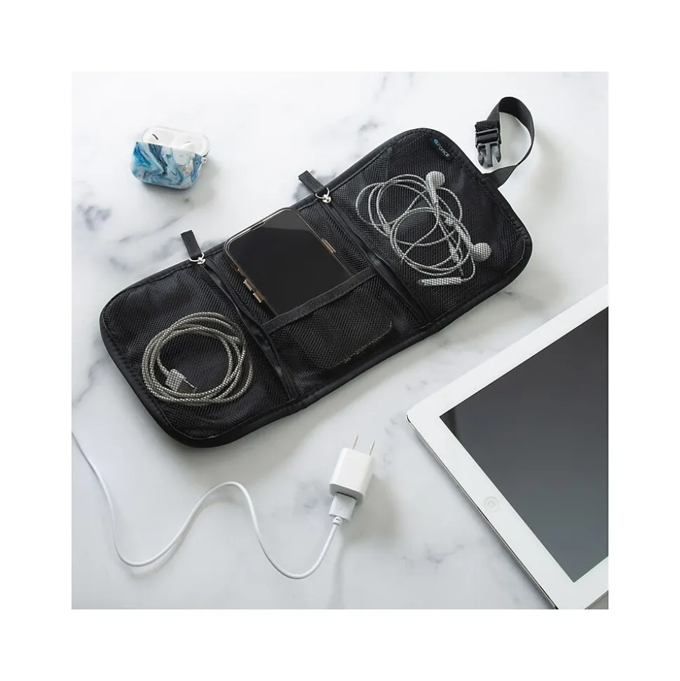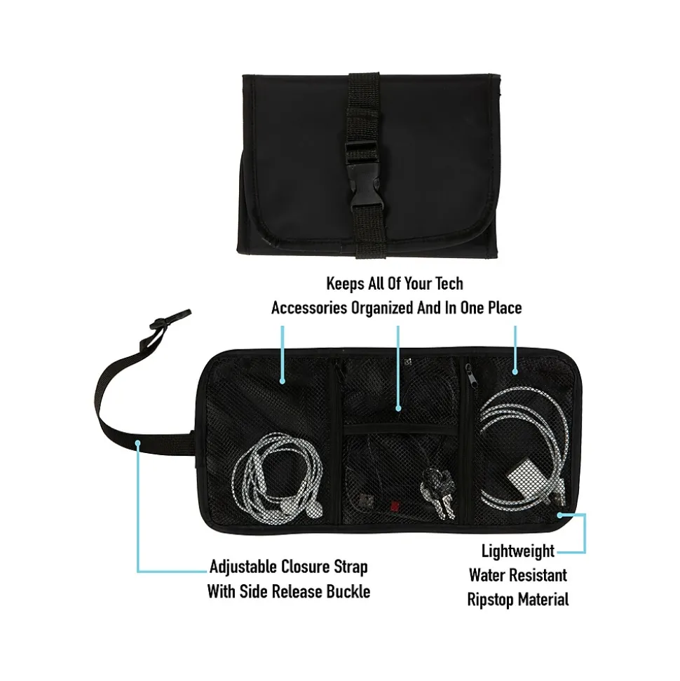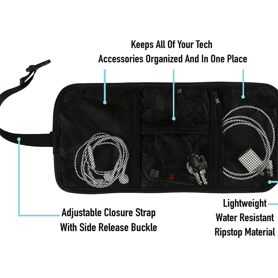 - Designed with three separate mesh pockets to store your chargers, headphones, and batteries, keeping them neat and detangled