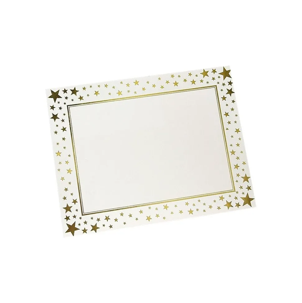 Create child-friendly, visually appealing award documents with these letter-sized star certificates. The gold foil star framing provides a symbolic design for preschool achievements, special milestones and various accomplishments in the performing arts. This 15-pack of Gartner Studios letter-size gold foil stars certificates is made with heavyweight 80-pound card stock paper and a classic parchment surface design for premium quality in printing and calligraphy applications.