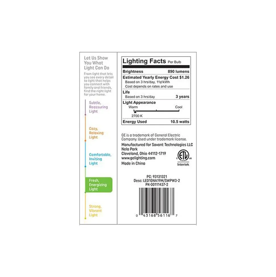 The GE LED light bulb offers outstanding energy efficiency, long-lasting performance, and just-right brightness, all in one package. It illuminates your home with warm, soft white light. Unlike CFL bulbs, this LED bulb features instant full brightness and is free of mercury. It’s great for frequently used fixtures: the LED’s long life and low energy use will help you save money on energy.