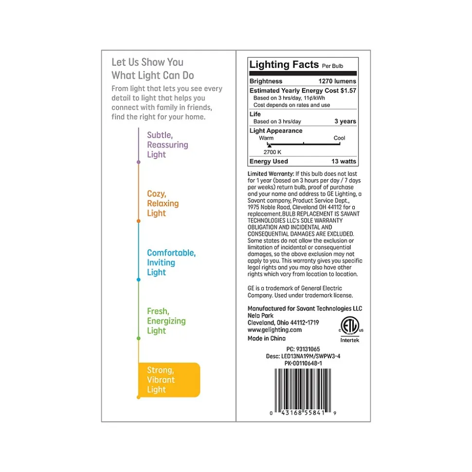 The GE LED light bulb offers outstanding energy efficiency, long-lasting performance, and just-right brightness, all in one package. The bulb illuminates your home with warm, soft white light. Unlike CFL bulbs, this LED bulb features instant full brightness and is free of mercury. Great for frequently used fixtures: the LED’s long life and low energy use will help you save money on energy.