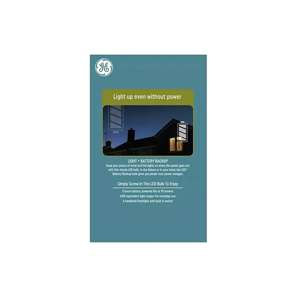 Keep your peace of mind and the lights on when the power goes out with this GE LED+ Battery Backup bulb. In the fixture or in your hand, the LED+ battery backup bulb gives you power over power outages. Never worry when the power goes out with the battery light bulb: this self-charging emergency light bulb allows you to keep a light on even when the power is off, and it can function similarly to a flashlight in emergency situations. Similar to emergency light bulbs, the GE LED+ backup battery bulb will automatically recharge when the electricity is on, providing reliable light in any situation.