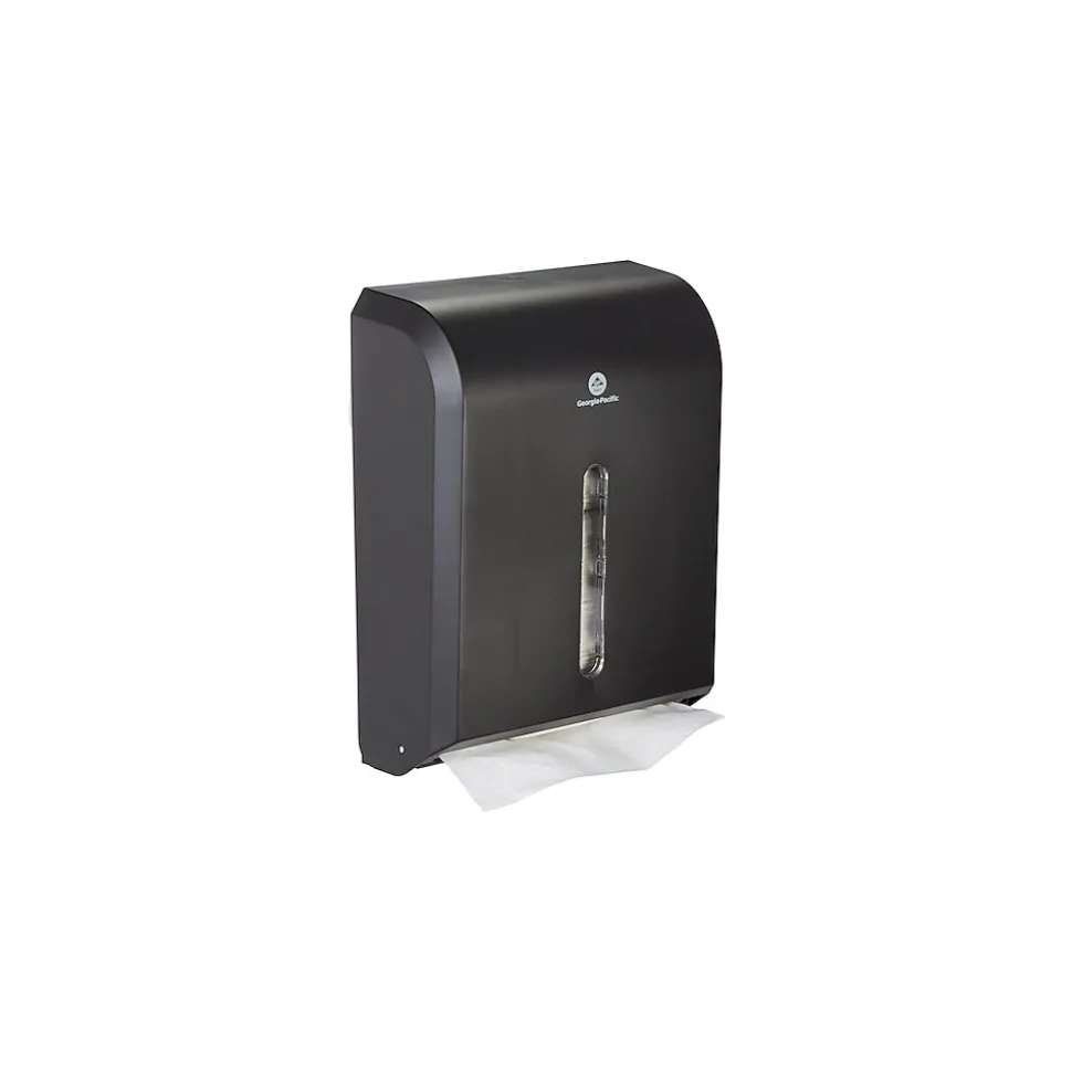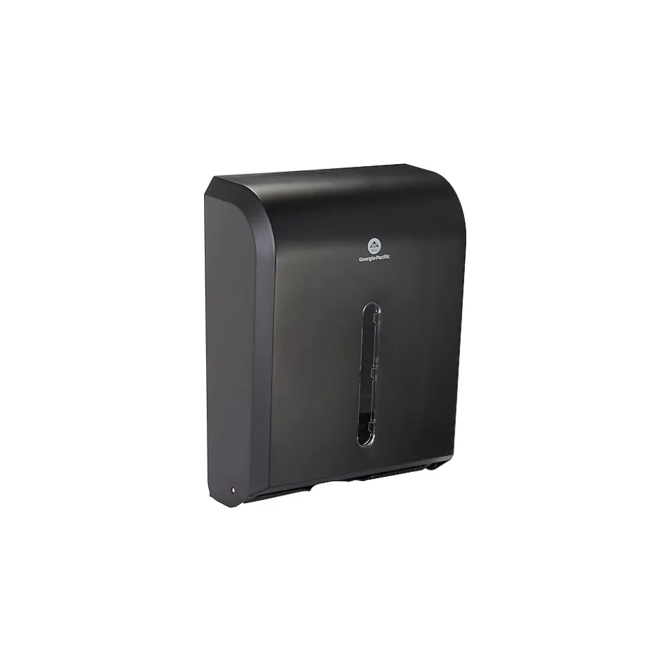 Burnish the image of your office or establishment with this Georgia-Pacific combi-fold Vista c-fold or multifold dispenser. Featuring a handsome design and a black finish to complement a wide array of interiors, this dispenser comes with a translucent cover that provides a tasteful level of discreteness while making it easy to find out when you are about to run out of towels.