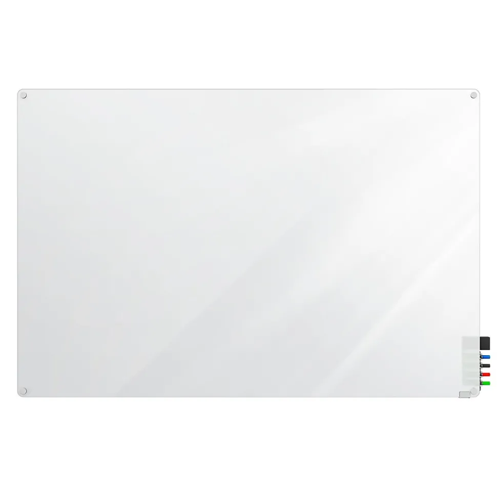 Harmony Frosted Glass Radius Corner Markerboards are eco-friendly – 100% recyclable and made from recycled glass and sand. Unframed boards feature 1″ radius corners, round standoffs and flat polished edges. Tempered glass, ¼” thick, provides a non-porous surface that will not ghost or stain and works with standard dry erase markers. With the rear face frosted for a translucent appearance, marker visibility is best when mounted on light to medium colored walls. Four or six pre-drilled mounting holes are inset into the glass and 1” diameter round satin aluminum standoff hangers create a 1¼” spacing between the wall and glass. The board features a clear acrylic rear-mounted accessory holder, complete with markers and eraser. Made in the USA.
