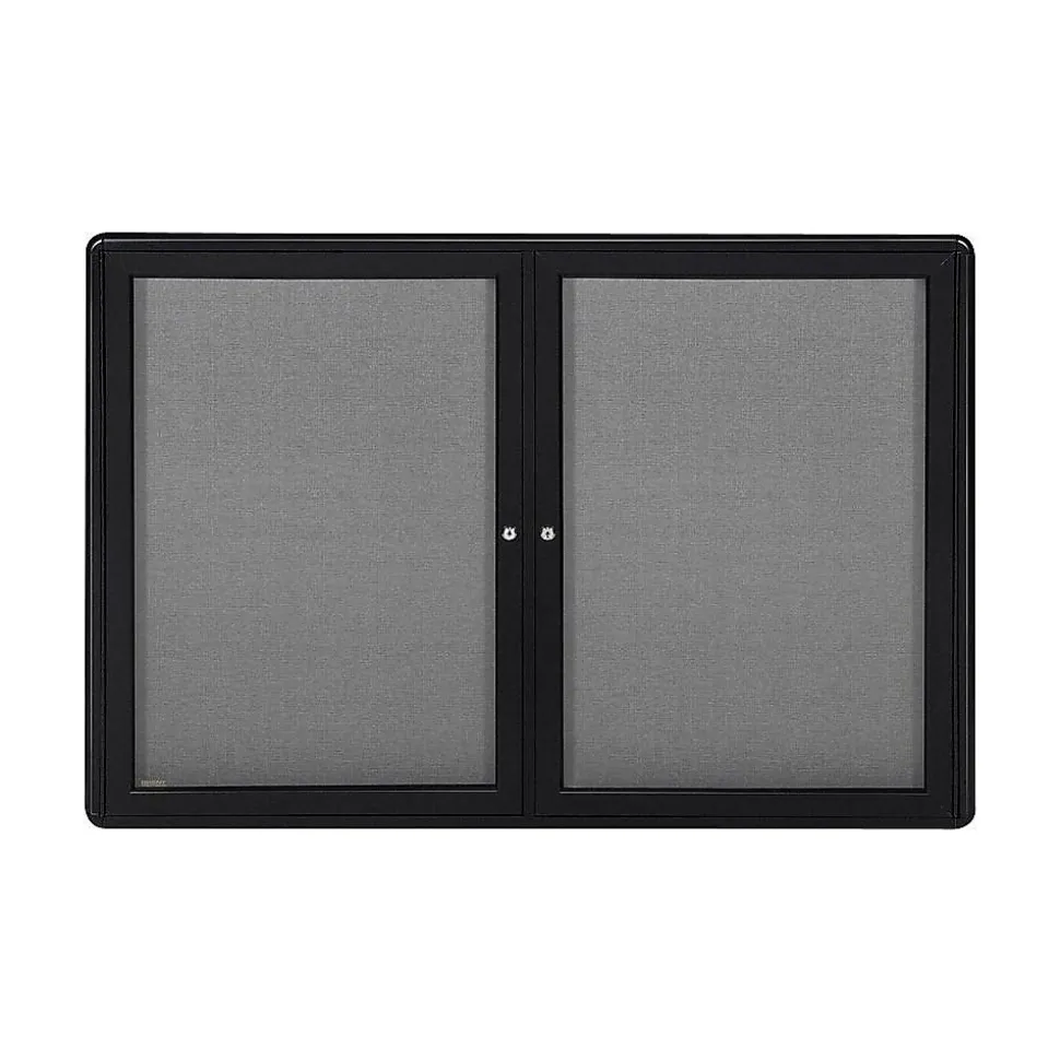Protect documents and keep them out of the way with this Ghent 3′ x 4′ enclosed fabric bulletin board. Each board features durable gray fabric backed by high-density fiberboard that holds pins firmly in place and is enclosed in a sturdy black powder-coated aluminum cabinet and frame with rounded corners. Two clear, shatter-proof, acrylic front doors lock to maintain visibility while preventing papers from getting lost or damaged, even in high-traffic areas.