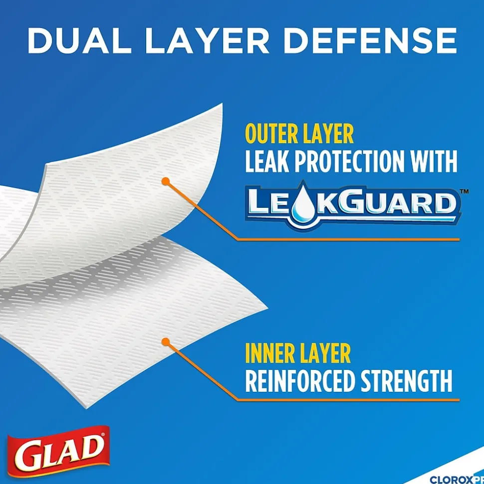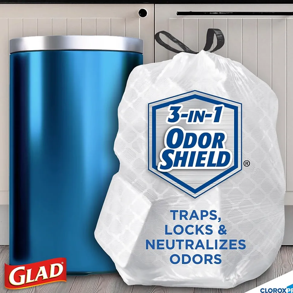 - 13 GALLON PLASTIC TRASH BAGS: Avoid messy kitchen or breakroom disasters with Glad Tall Kitchen CloroxPro Drawstring Trash bags, designed with stretchable strength to handle the heaviest loads without tearing