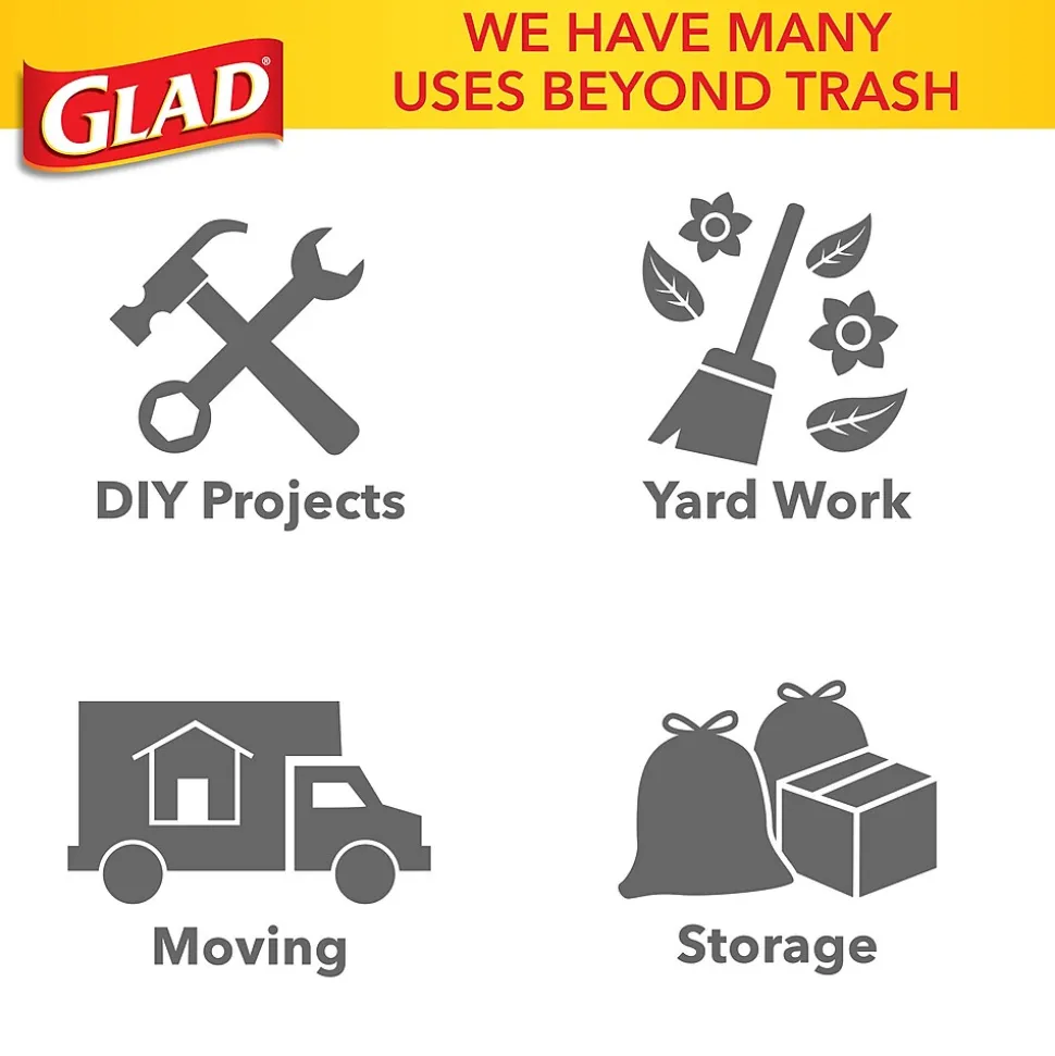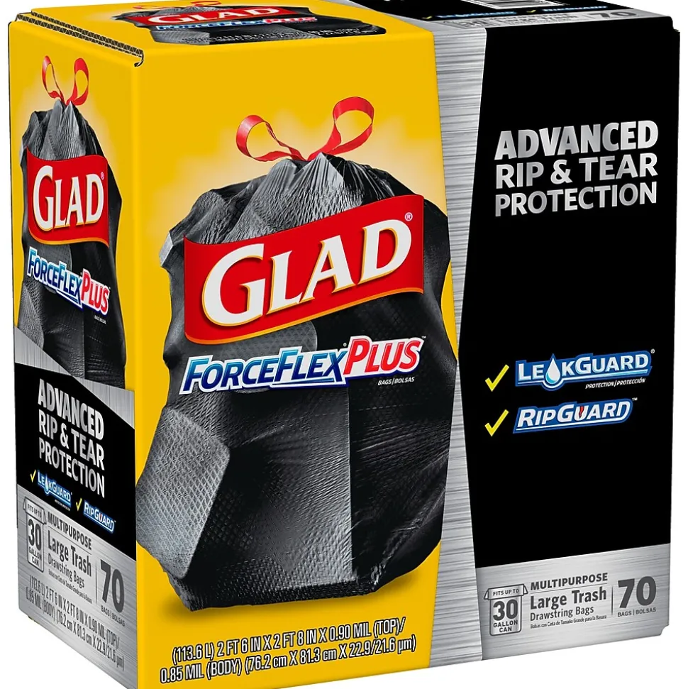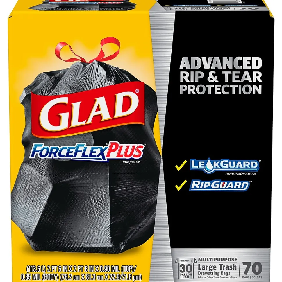 Glad® ForceFlexPlus™ Drawstring Bags are designed with Durable Strength™ with a reinforced side seam to let you carry the heaviest loads without tearing the bag. The large capacity bags fit a 30 gallon can and stretch around your trash with the ForceFlexPlus™ technology to prevent rips and tears. Built with advanced rip and tear protection, the LeakGuard™ Protection and RipGuard™ Protection can withstand even the toughest and messiest trash, so that what goes in, stays in. The strong reinforcing drawstring closure grips the can and ensures easy closing and lifting with one quick pull. These garbage bags are perfect for tough jobs throughout your home or office, indoor or outdoor. Ideal for use in restaurants, offices and other commercial facilities. Take out the trash with Glad® reliability and guaranteed stretchable strength.
