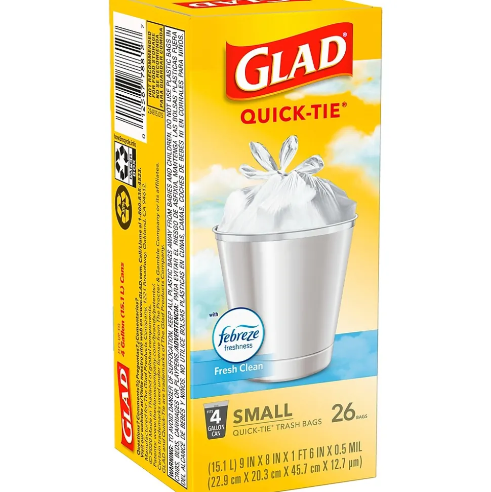 Glad® OdorShield® Quick-Tie® Small Trash Bags with Febreze® provide strength plus odor control, to keep homes and workplaces smelling fresh and clean. These small garbage bags are made with OdorShield® technology and Febreze® freshness to provide continuous odor neutralization, based on time lapse technical evaluation, for long lasting freshness around the house or workplace. They are also strong and sturdy to avoid messy trash disasters as you transport it. These 4 gallon size trash bags, in Fresh Clean scent, fit small size trash cans and are great for use in restroom, kitchen, desk and break room bins. Ideal for use in schools, daycare centers, restaurants, hotels and other commercial facilities.