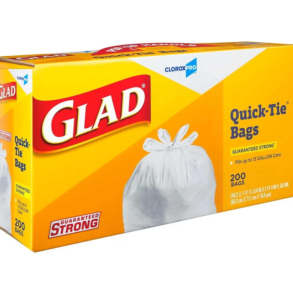 Made with 3 ply strength, the Glad CloroxPro Quick-Tie Tall Kitchen Trash Bags are strong and sturdy for all your commercial needs. The Quick-Tie strong and dependable built in flaps provide easy closure for your big trash loads. The easy tie flaps help keep the bag securely shut to avoid messy trash disasters as you transport it. No need for inconvenient twist ties that can be misplaced; just close the bag by cross tying the handles and you’re done. You can transport even the fullest garbage bag without any worries of spillage. Also, the 13 gallon size is great for a variety of uses around your home or office, like storing and protecting toys, blankets, linens, clothes or covering furniture, lining a litter box, or even use as a laundry bag. Ideal for use in schools, daycare centers, restaurants, hotels, and other commercial facilities. For your toughest trash needs and seasonal cleaning, trust Glad.