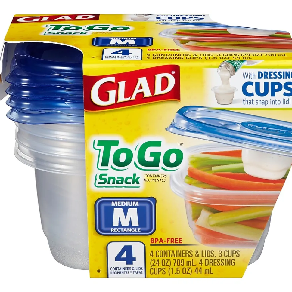 Glad To Go Lunch food containers prevent soggy salads and foods by keeping dry and wet ingredients separate until you are ready to eat. These containers feature little dressing cups that snap tightly into the lids. Containers are the perfect size for packing items like salad and dressing, dip and chips, or breakfast items like pancake and syrup. Lids snap tightly to dressing cups and containers to prevent leaks and spills. BPA free and microwave safe, you can safely heat food in these containers. Clean up is quick and easy because they are dishwasher safe. Glad To Go containers are designed for life on the go. When you use Glad, you know your food is receiving quality protection. Ideal for use in restaurants and other commercial facilities.