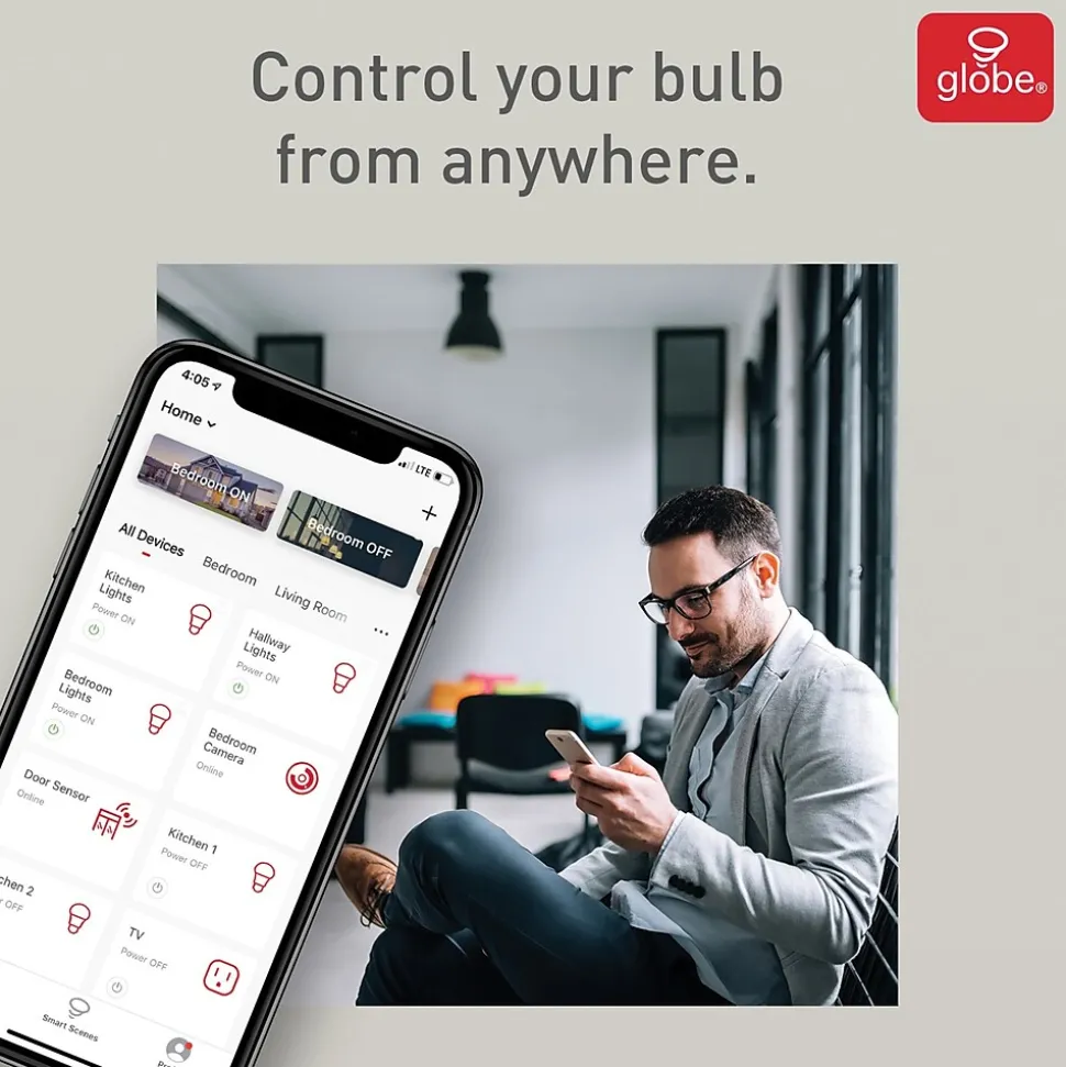 - Ability to create Trigger Scenes to control multiple Globe Electric smart devices with 1 tap or create an Automatic Scene that only activates when predetermined conditions are met, such as Turn ON Smart Bulb to 75%, when it is {Raining}