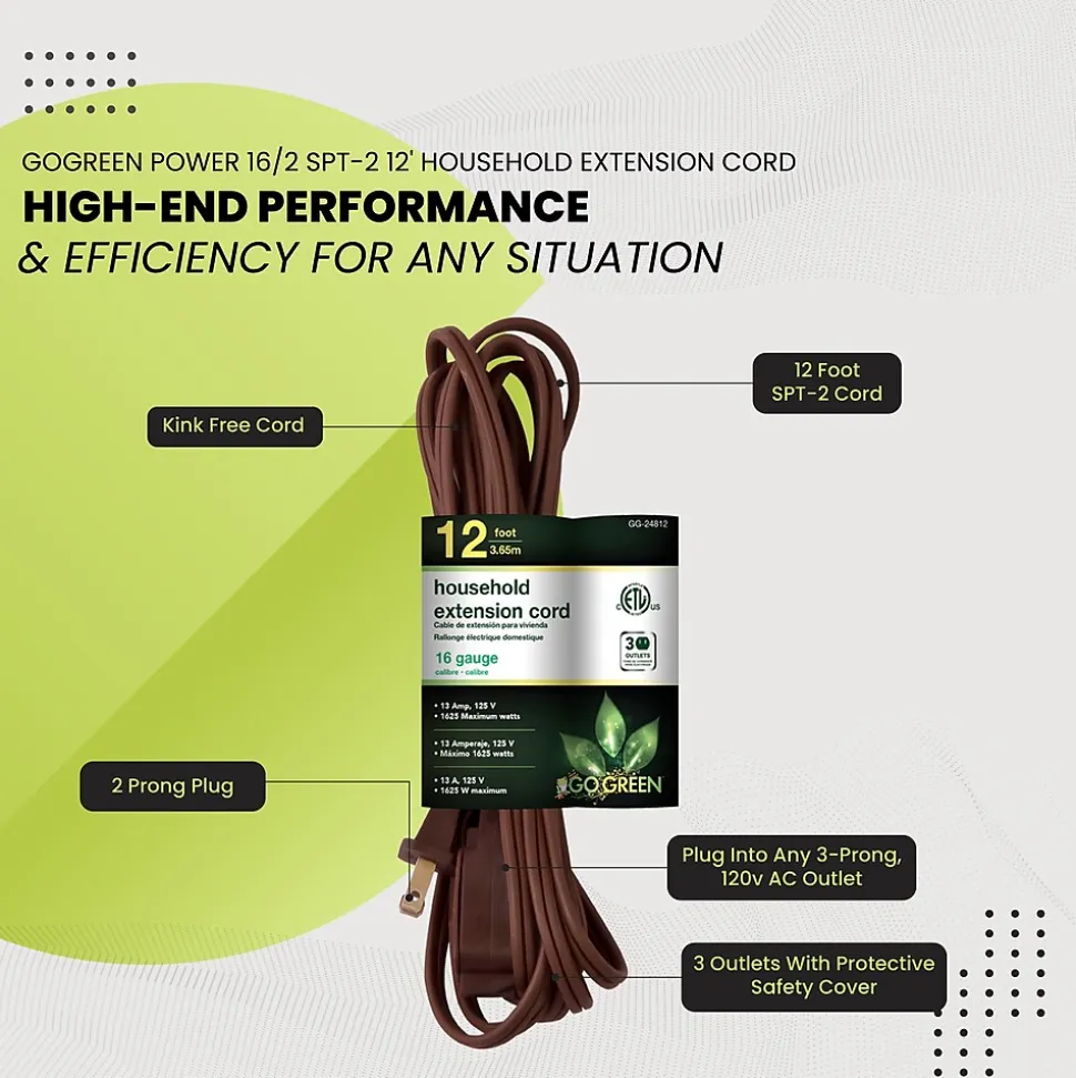 The GoGreen Power household extension cord is great for indoor use in the office and at home. Cord is industry approved and is ETL Listed